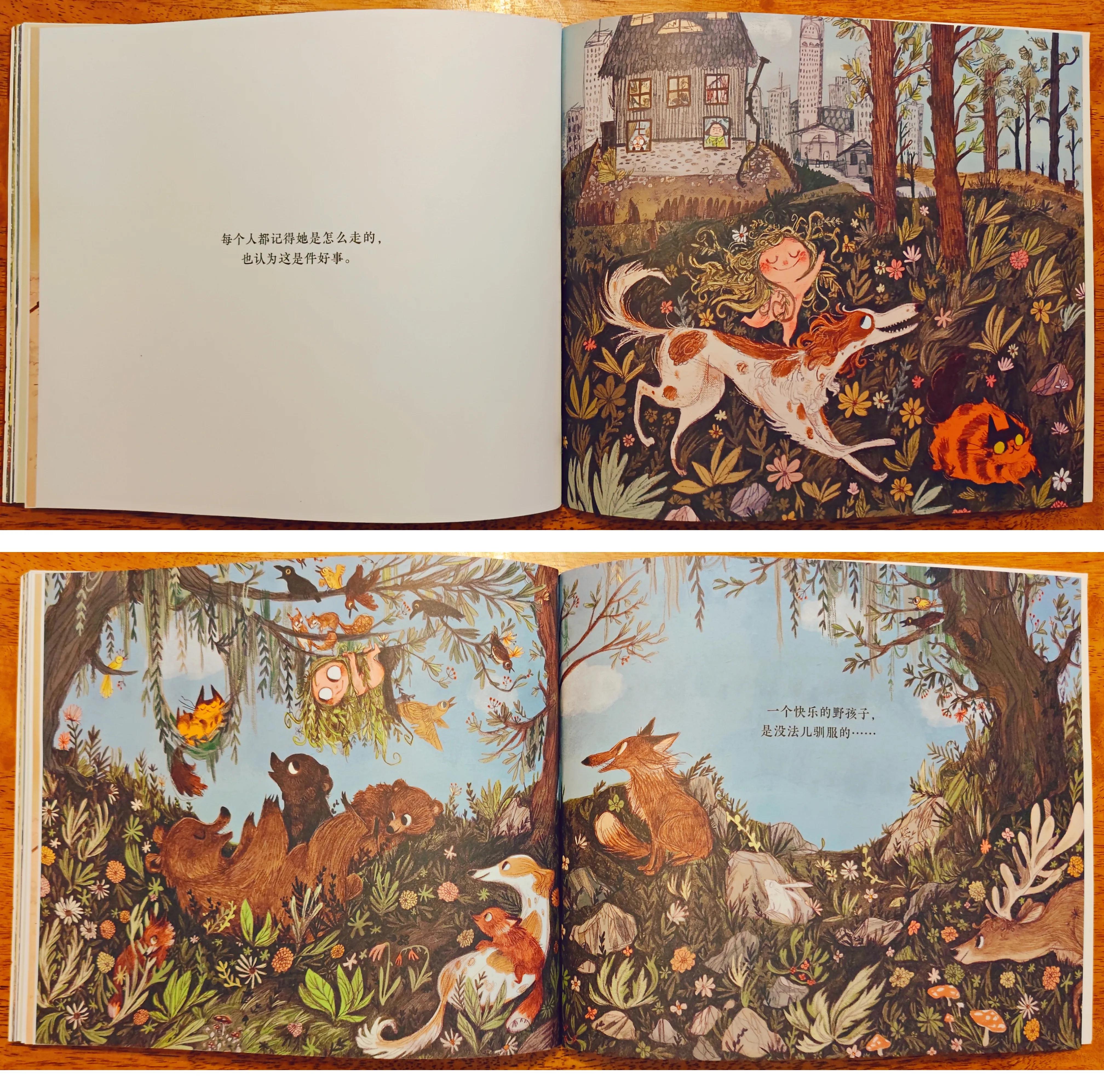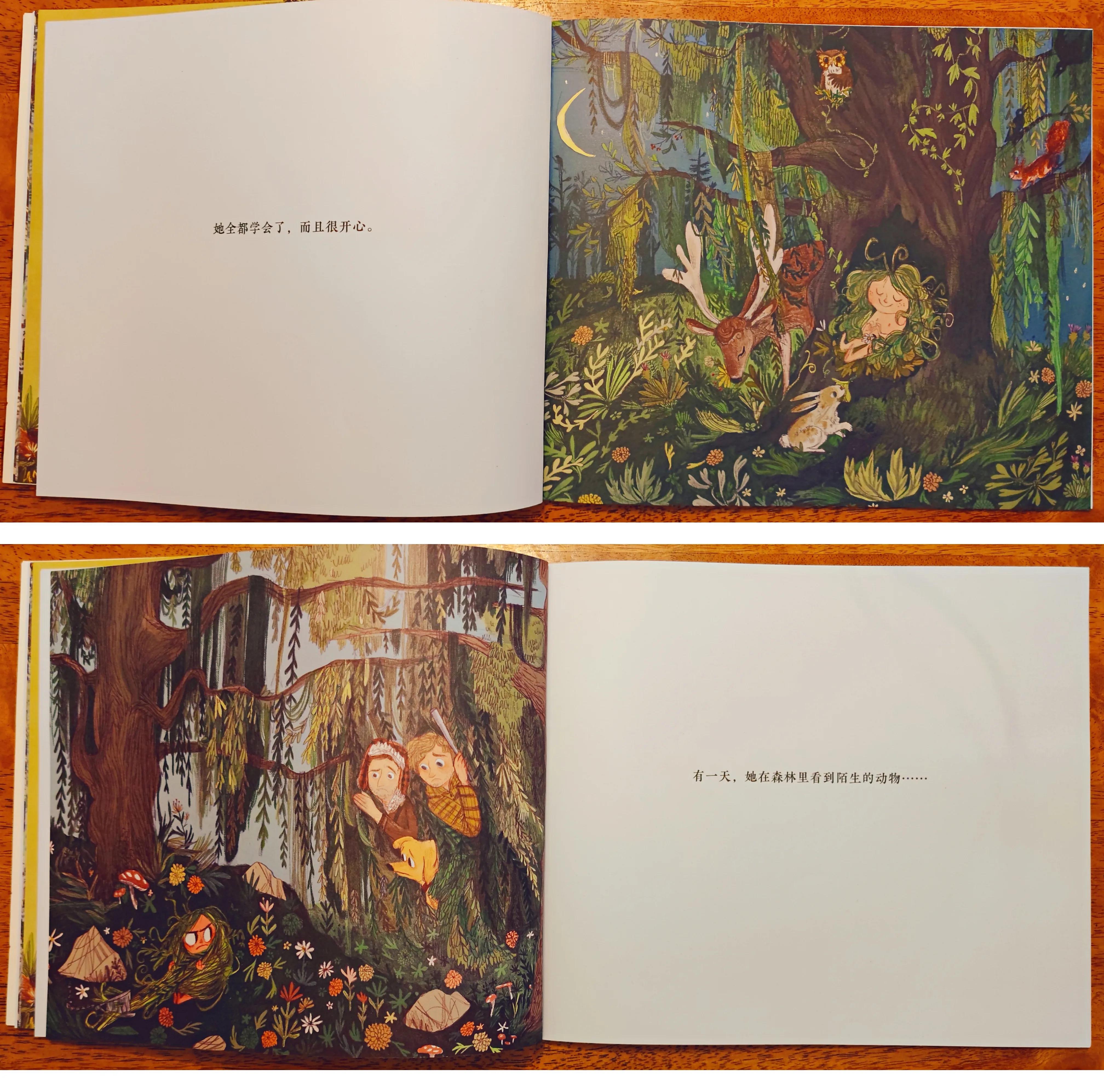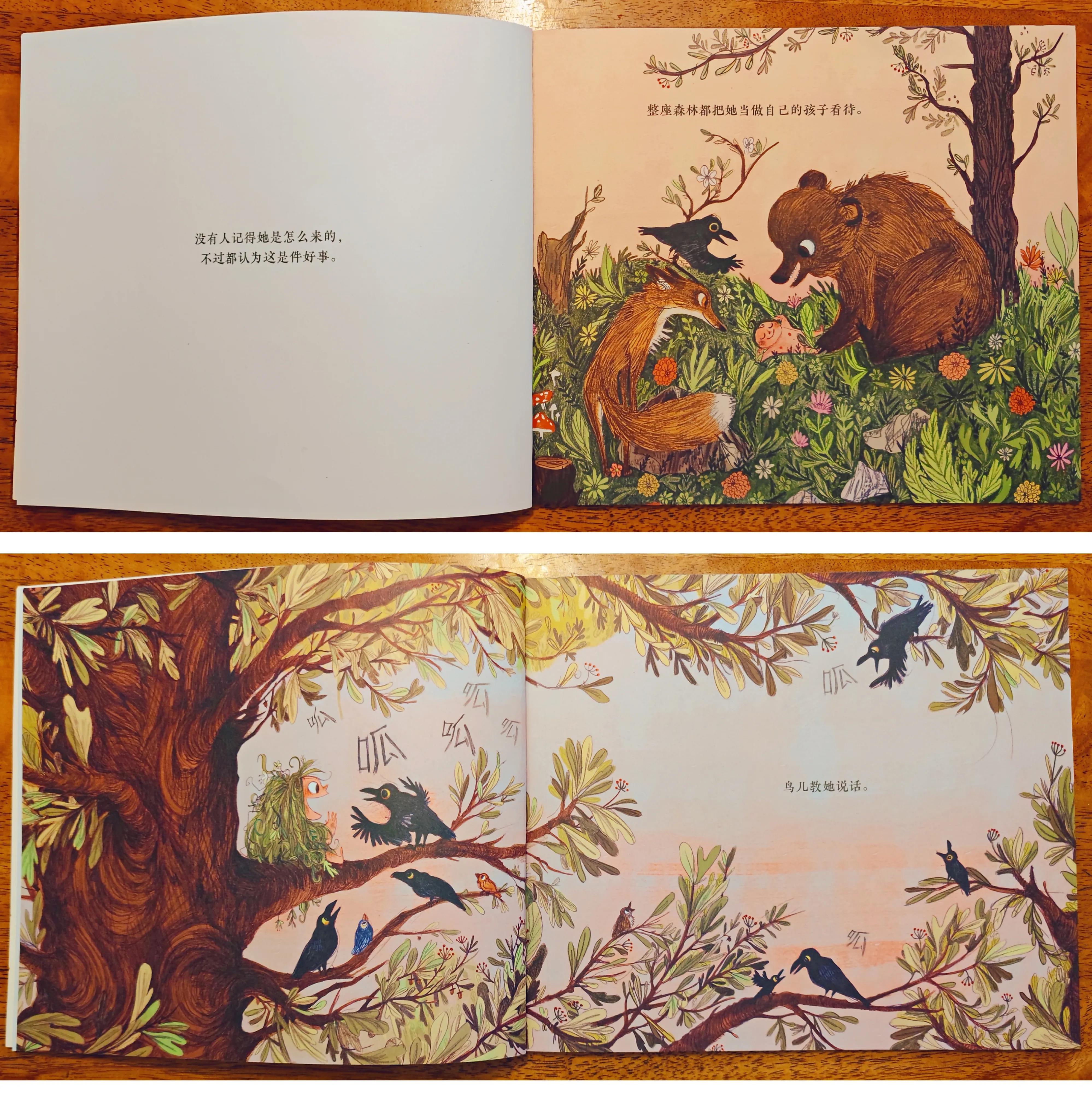“一个快乐的野孩子,是没法儿驯服的……”没错,绘本里这个小女孩是属于森林、属于自由的大自然的。还是小婴儿的她就这样出现在了森林里,鸟儿们教她说话、大熊教她怎样吃东西、成群的狐狸教她如何玩耍……在森林生活的每一天,小女孩都无比地自在与开心,直到,“有一天,她在森林里看到陌生的动物……”