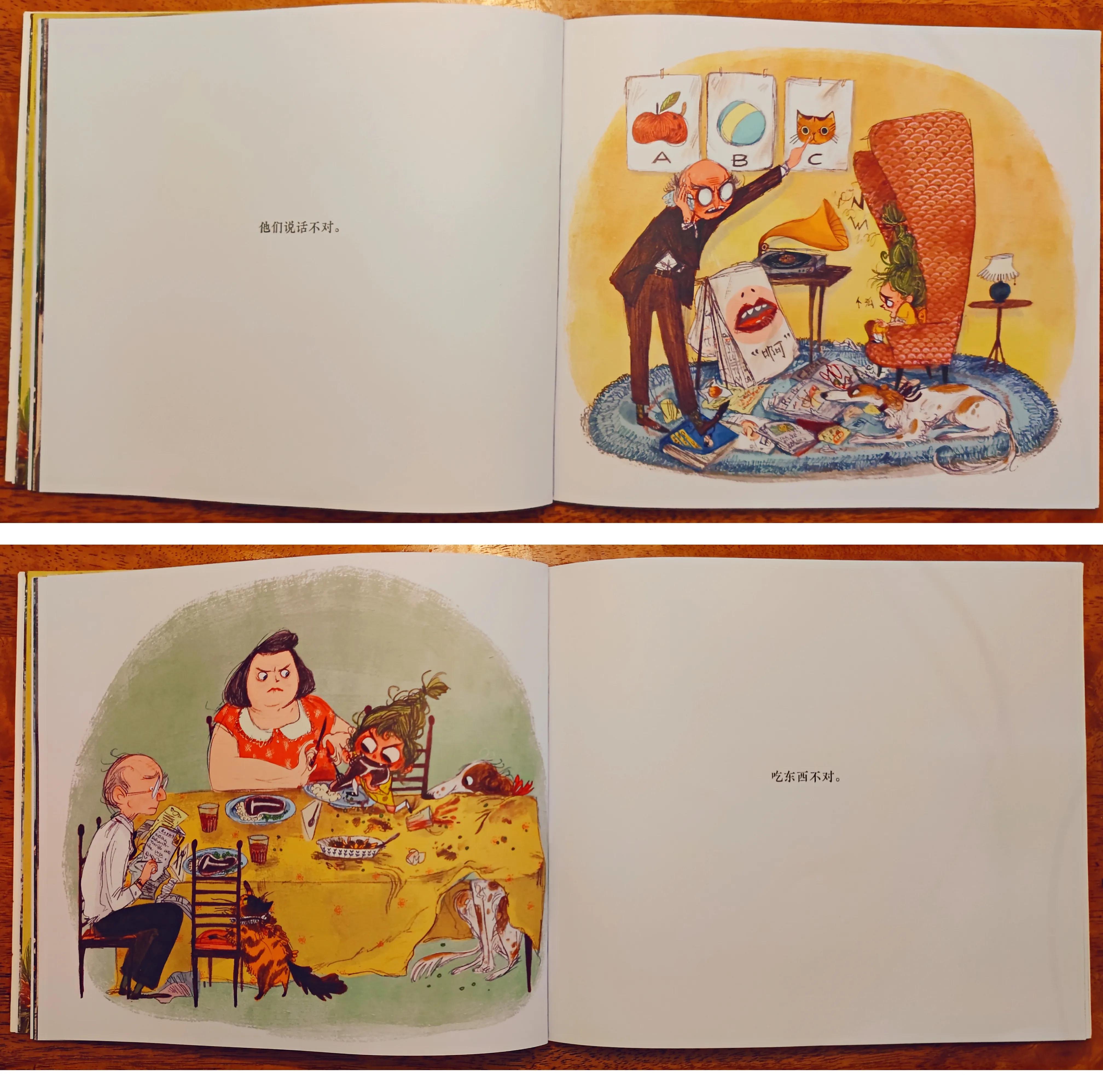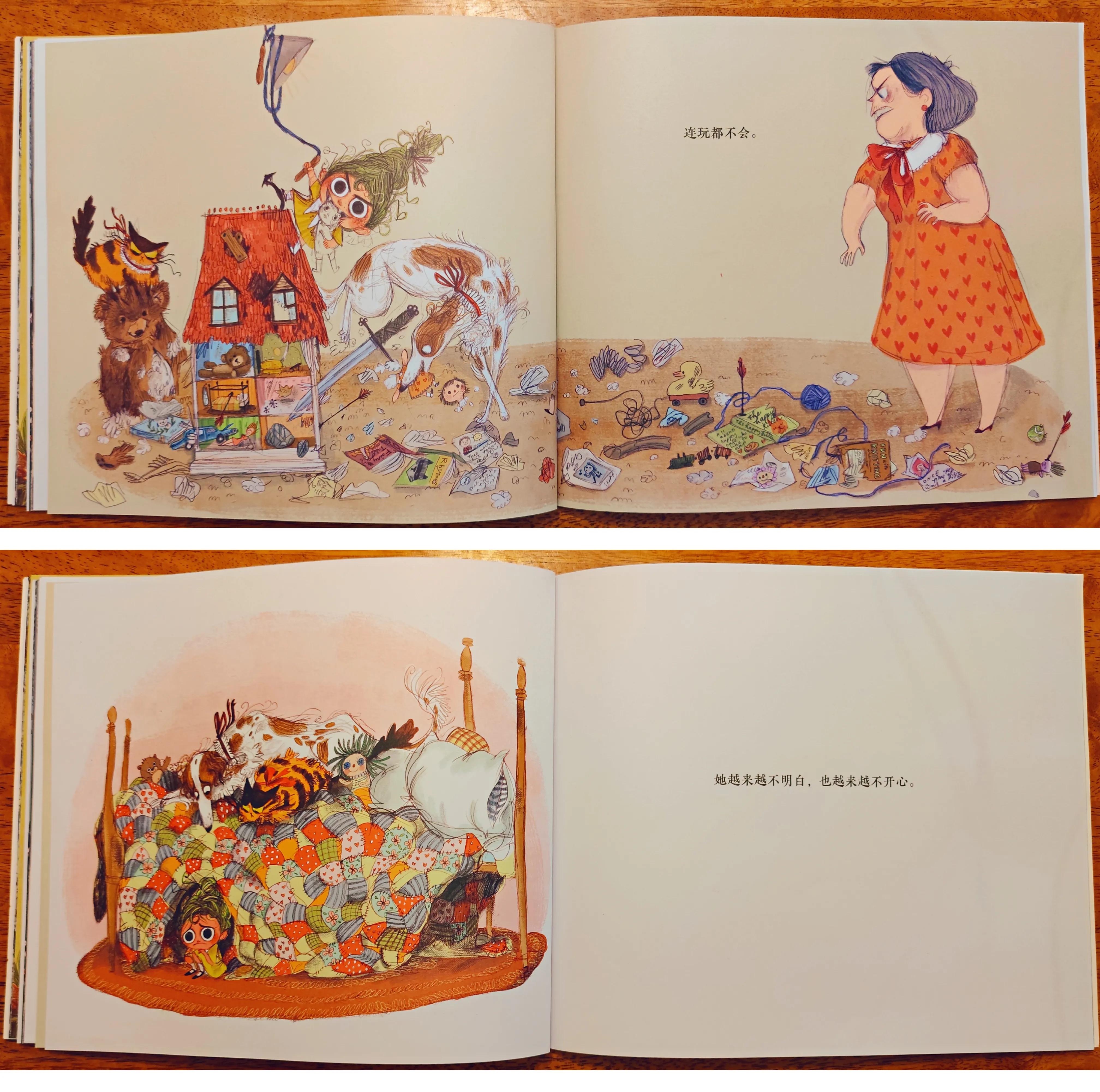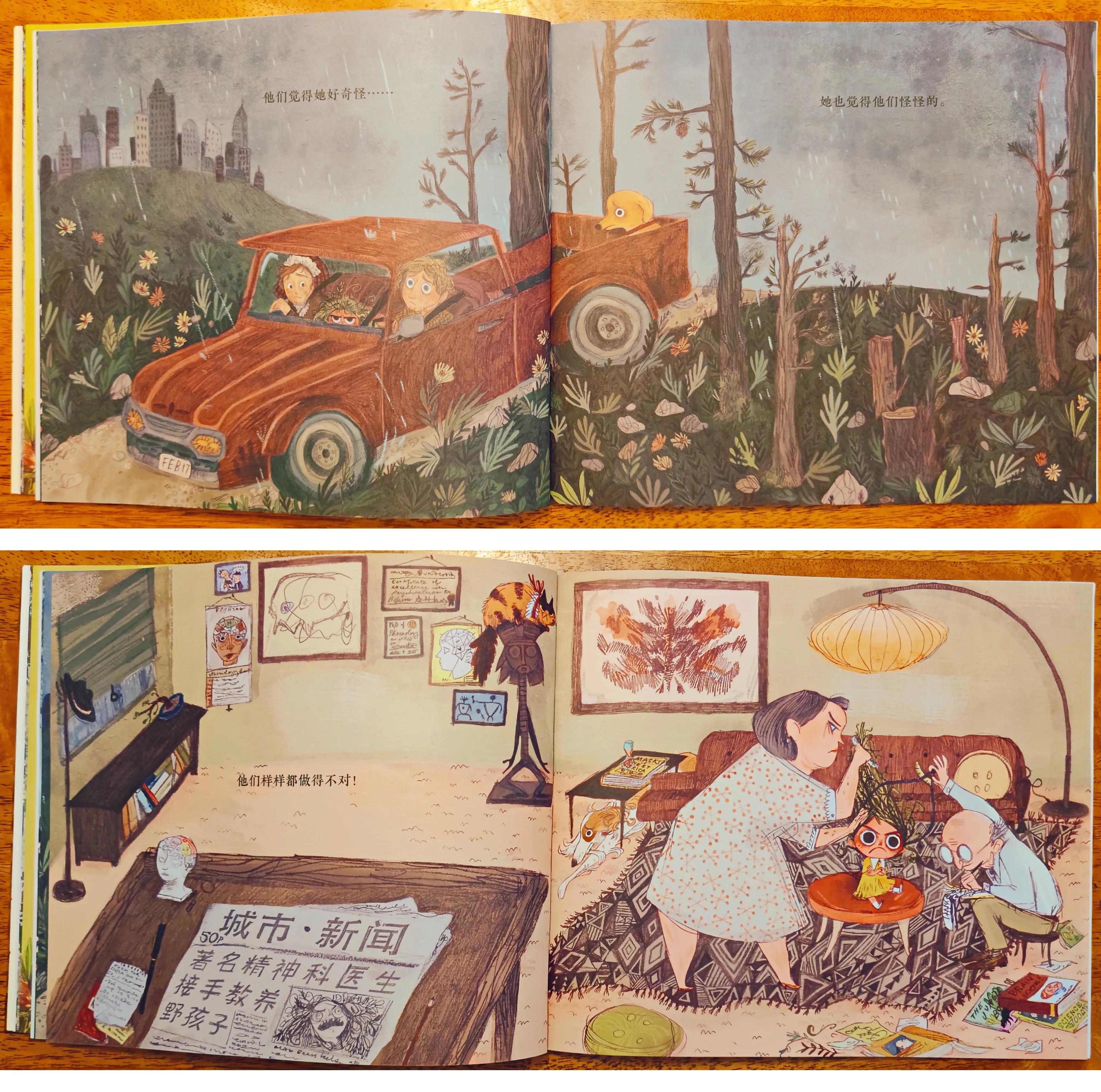“一个快乐的野孩子,是没法儿驯服的……”没错,绘本里这个小女孩是属于森林、属于自由的大自然的。还是小婴儿的她就这样出现在了森林里,鸟儿们教她说话、大熊教她怎样吃东西、成群的狐狸教她如何玩耍……在森林生活的每一天,小女孩都无比地自在与开心,直到,“有一天,她在森林里看到陌生的动物……”
