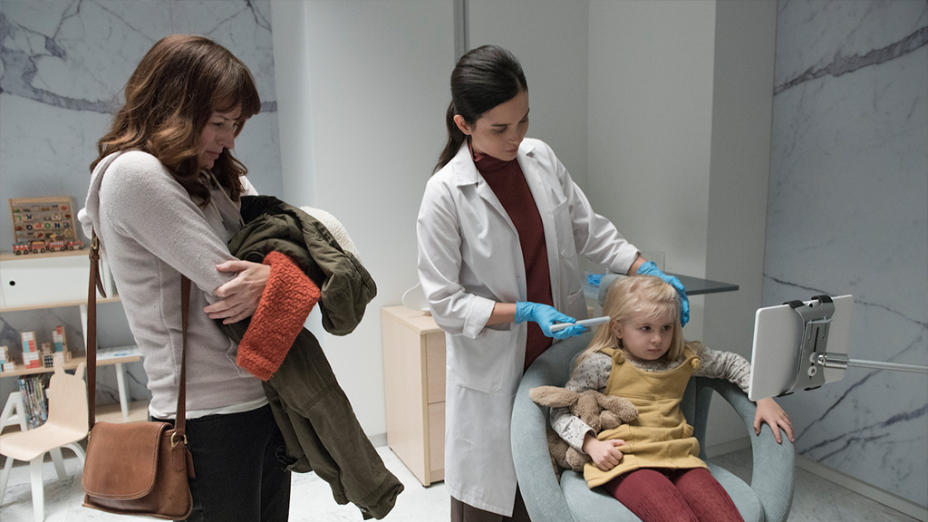 正在为小女孩植入监控系统《方舟天使》是本季比较普通的一集,探讨的主题生活化且非常真实,但在叙事方面有点太过于容易预测导致整体的表现不够惊艳。故事围绕在一个可以植入在人体内的监控系统,家长透过这样的装置可以看到孩子的一举一动,甚至可以用滤镜功能“订制”要看到的内容,隔绝危险与不适当的内容。乍看之下完美无瑕的家长管理工具,却剥夺了孩子冒险成长的机会,使得主角的小孩慢慢以极端的方式探索真实世界。