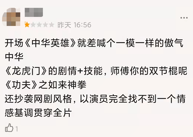 《新精武门:武魂》就更过分了,一连“致敬”了好几部电影,可这些不同电影中的桥段拼凑在一起,却没有一个能将之串联起来的内核,导致观众从头尬到尾。目前豆瓣仅有的几个评论中,基本都是吐槽的,说明观众并不买账。