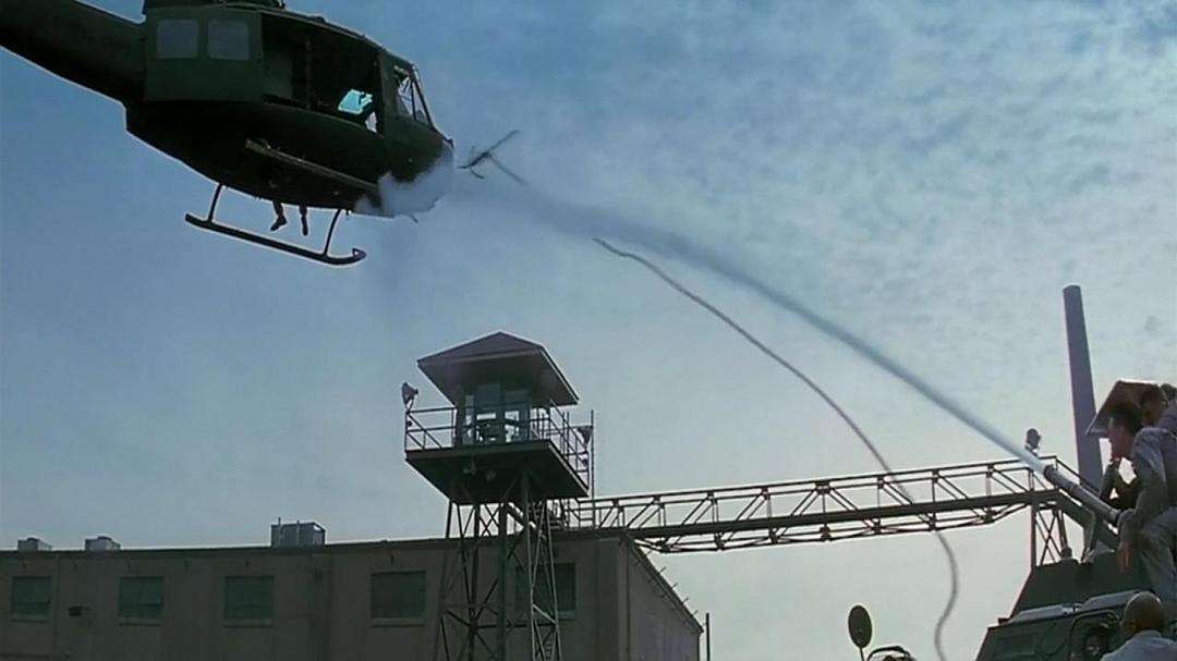 狱警们都在牢房中,而囚犯们都在操场之上,老埃让人把监狱楼的门锁上,然后开始了下一步计划,他们将水炮车的供水管关了,然后又抢夺了直升机,撞毁了监狱墙上的塔楼,就这样成功的控制了监狱。