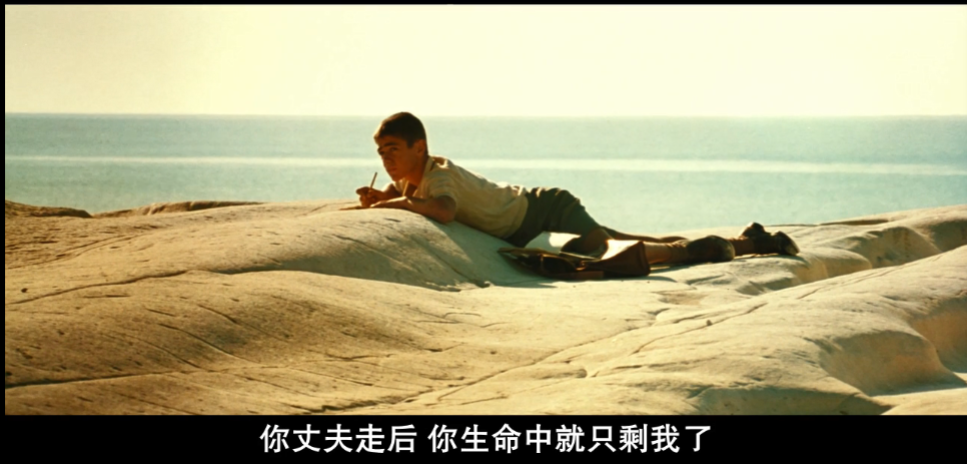 雷纳多伏在海滩边,写了对玛莲娜诉衷肠,并且想要保护她的信,却始终没有勇气寄出。