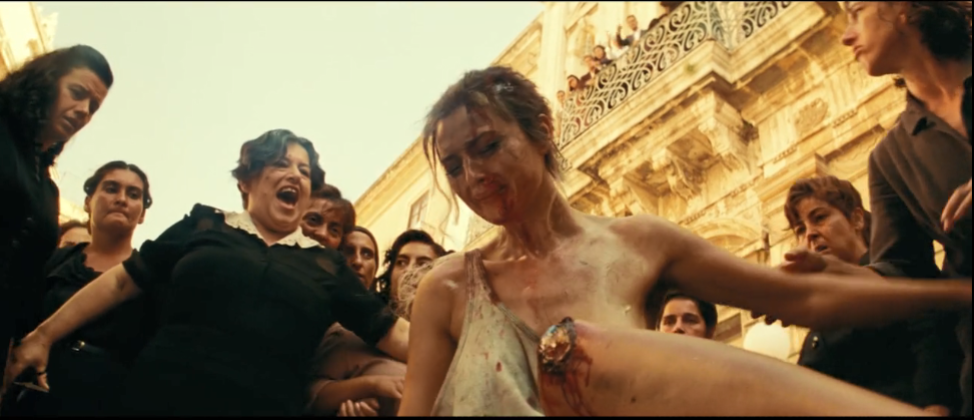 影片以1941年的某一天作为开场:墨索里尼在这一天正式向英法宣战。这座位于西西里岛的小镇笼罩在一片狂热的战争氛围当中。在纳粹充满煽动力的广播宣讲声中,民众们纷纷走上街头、进入广场,欢呼示威。好比一群乌合之众,陷入了狂热及集体无意识,而此时的小镇,就象征了一个人性试炼场,来展现出人性的阴暗面。导演在影片一开始,就突出了影片的批判讽刺意味。