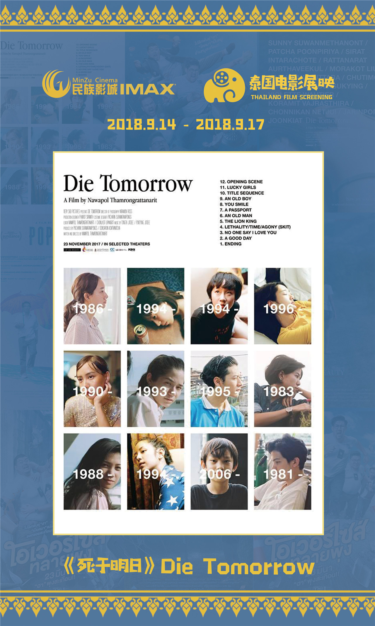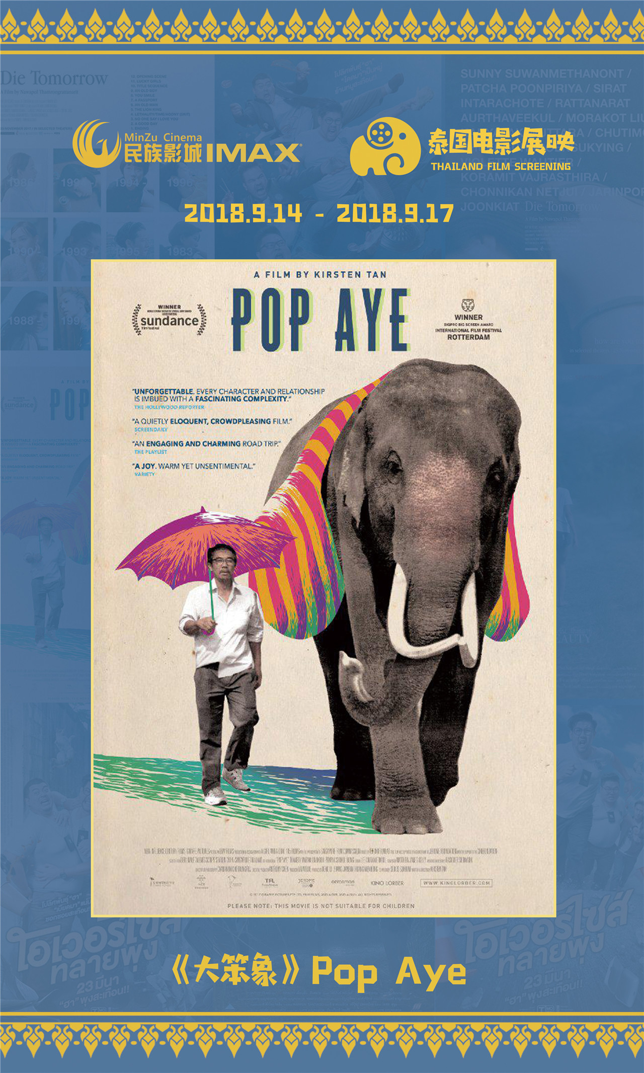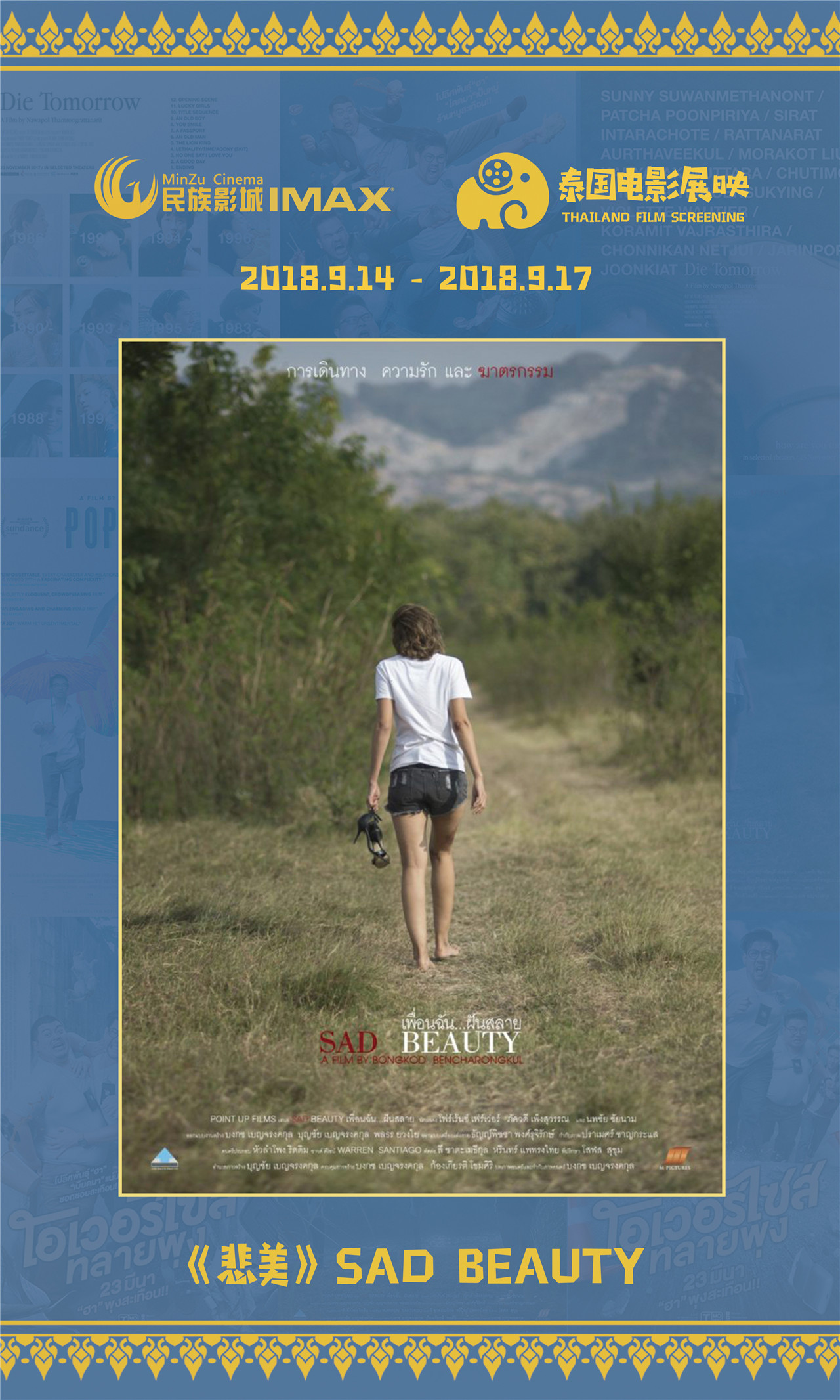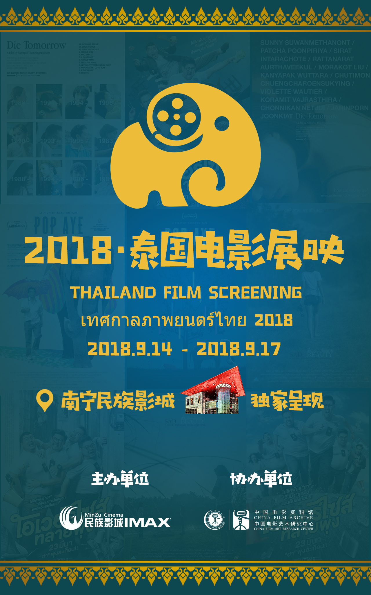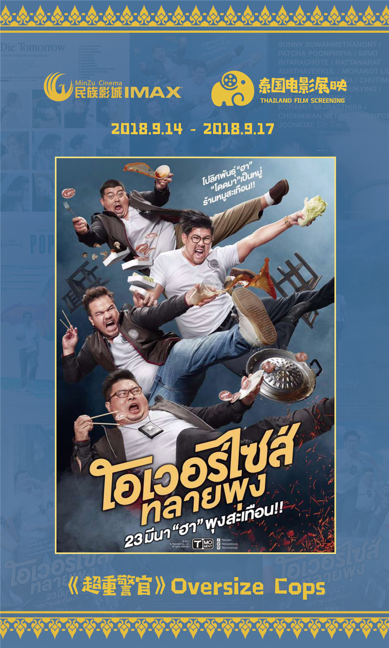 容浥对电影节作了一个全面详细的介绍。他表示,结合去年成功举办“2017·印尼电影展映”活动的经验,民族影城更有信心举办好“2018·泰国电影展映”活动,在举办规模和公众影响力上都有着令人惊喜的发展。今年,为了打造这场绚丽的“光影盛宴”,主办方民族影城在策划、邀片、排片、宣传推广等方面精心筹备,精选出4部泰国电影佳作。这批题材丰富、类型各异的影片,将于9月14日至9月17日,在南宁民族影城集中展映。开幕式影片为《超重警官》,其他展映影片分别是《大笨象》、《死于明日》、《悲美》。