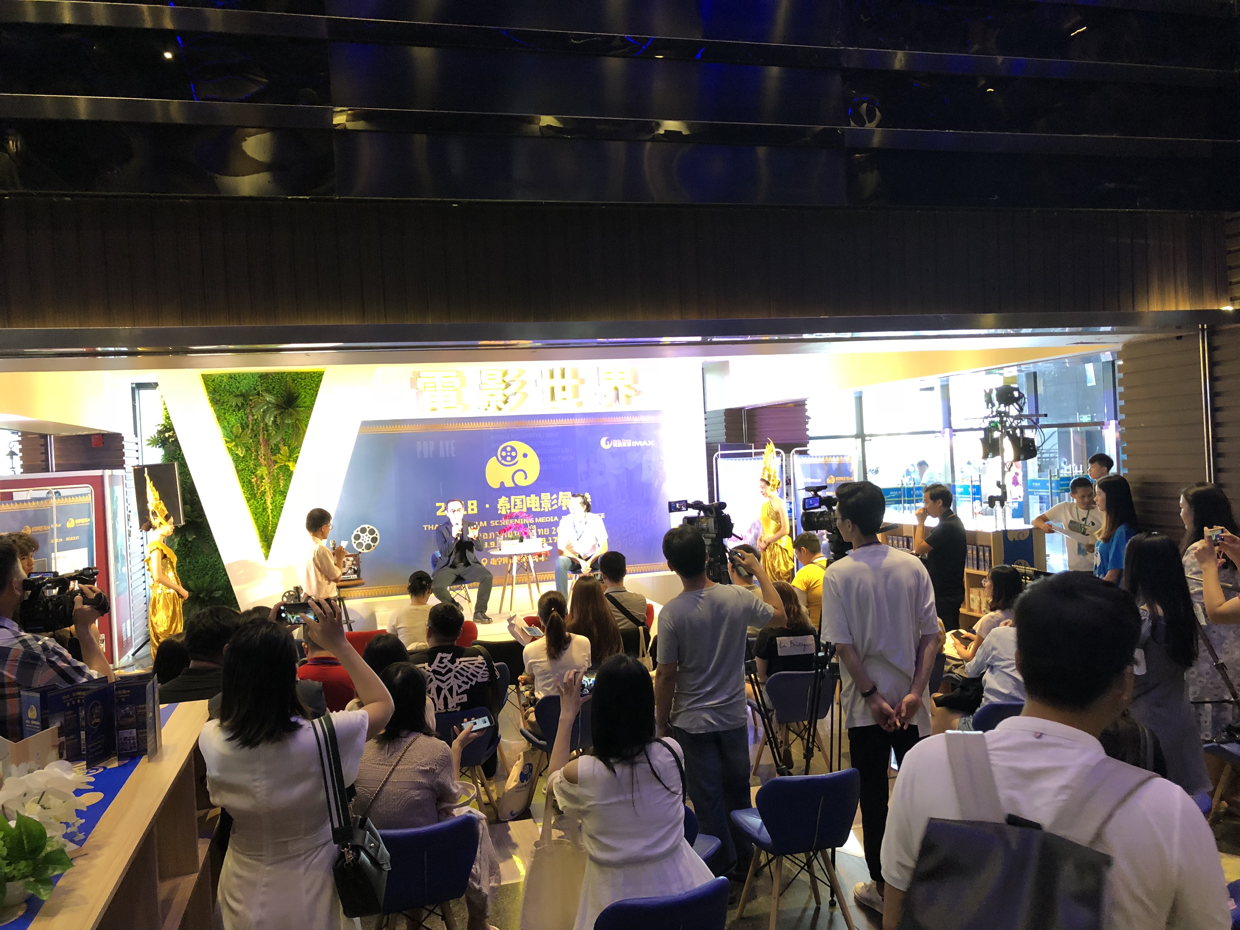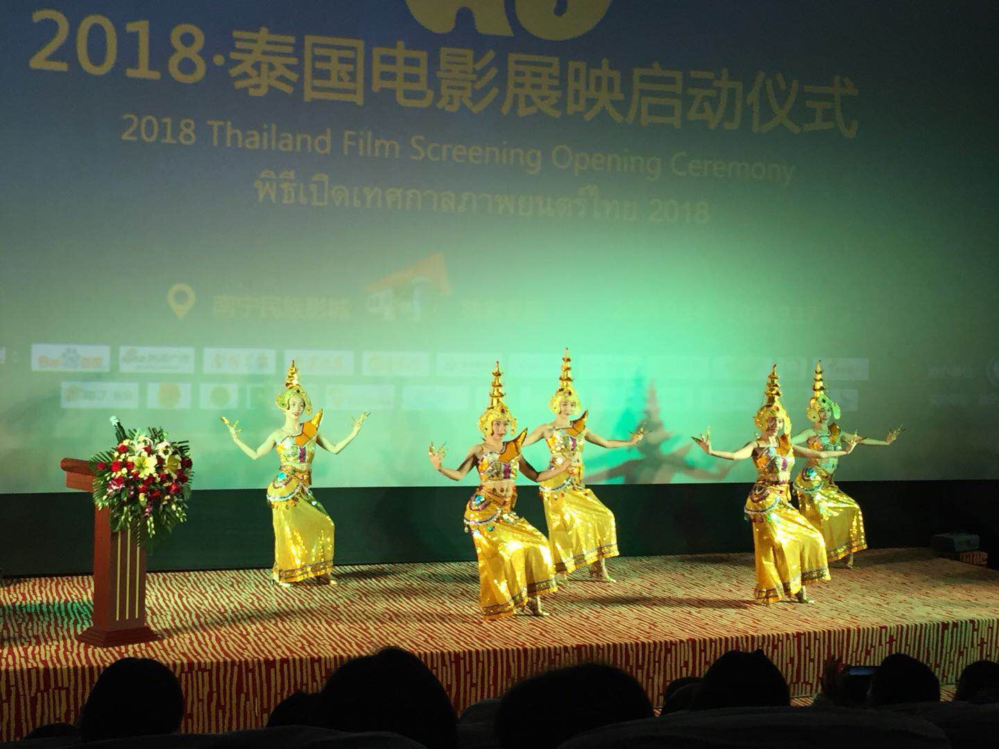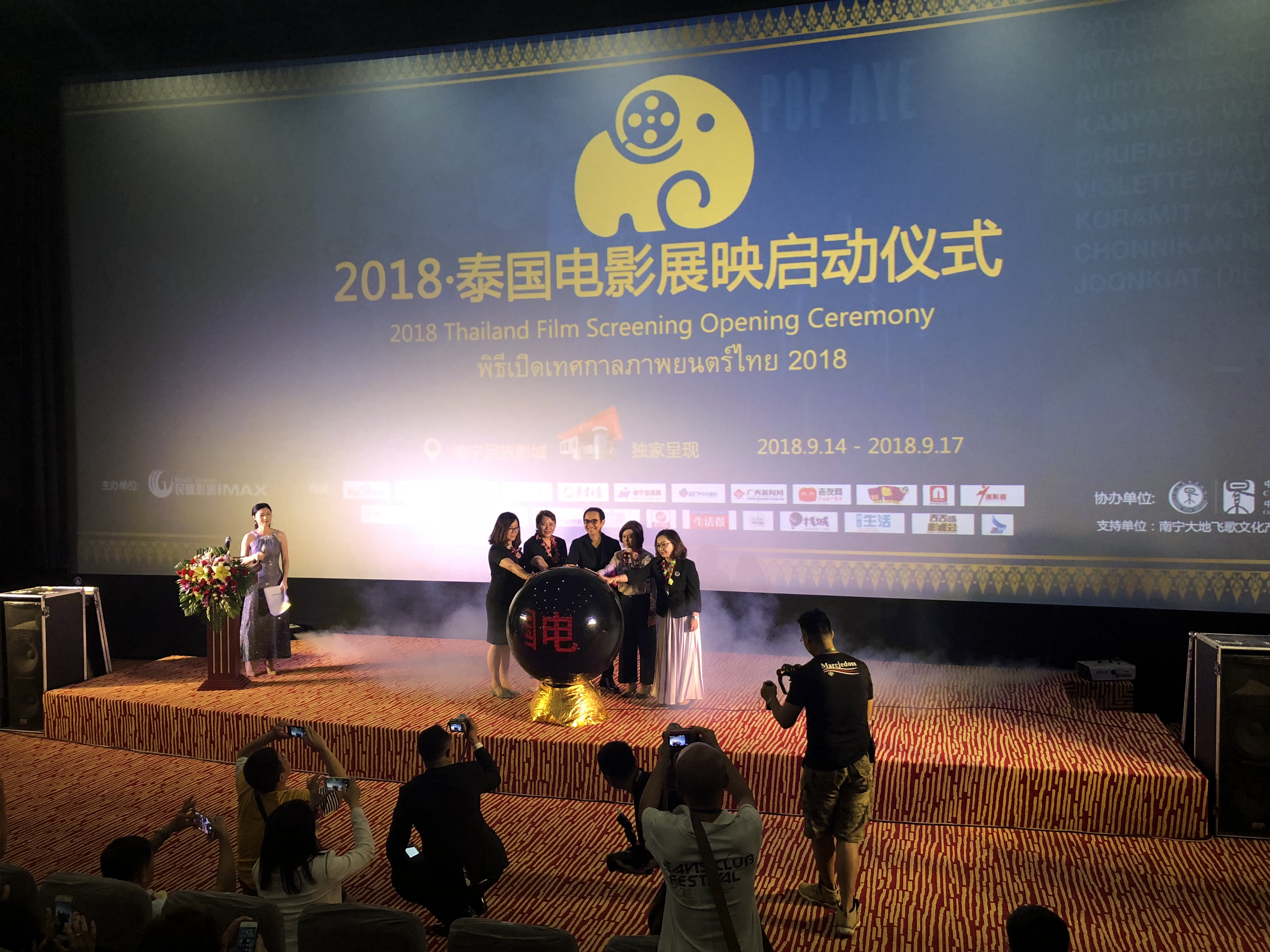 随后,“2018·泰国电影展映”启动仪式在民族影城2号4k全景巨幕厅举行,通过开场的歌舞《泰国吉祥舞》对到场的国内外嘉宾致以谢意和敬意。随后,主持人公布本次活动到场嘉宾:泰王国驻南宁总领事馆副总领事,季缇玛女士(mrs. chittima iamsudha)、泰国国家旅游局昆明办事处副处长,朱玉珍女士(ms.urai mukpradabthong)、电影《大笨象》主演塔内·瓦拉库努娄先生(mr. thaneth warakulnukroh)、南宁民族影业文化娱乐有限责任公司 党支部书记 董事长 苏红女士、南宁民族影业文化娱乐有限责任公司 党支部副书记 工会主席 黄勇先生、南宁民族影业文化娱乐有限责任公司 副总经理 南宁民族时代影业有限公司 总经理 何涛女士、南宁民族影业文化娱乐有限责任公司 副总经理 秦卓颍先生、广西文化产业集团八桂同映电影院线有限公司董事长万兴伟先生。