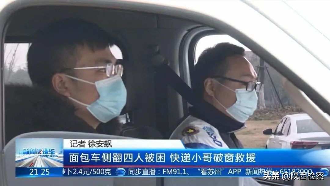 江苏昆山一车辆侧翻,4人被困,路过的快递员谢先生、王先生发现后,徒手抓住破碎的挡风玻璃扩大缺口,救出被困人员。