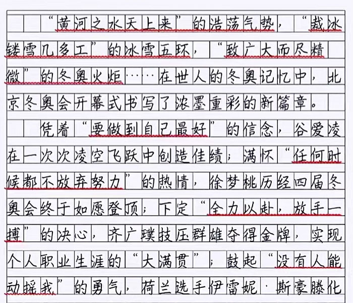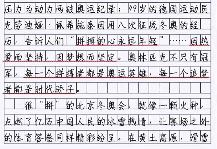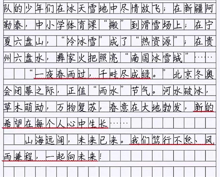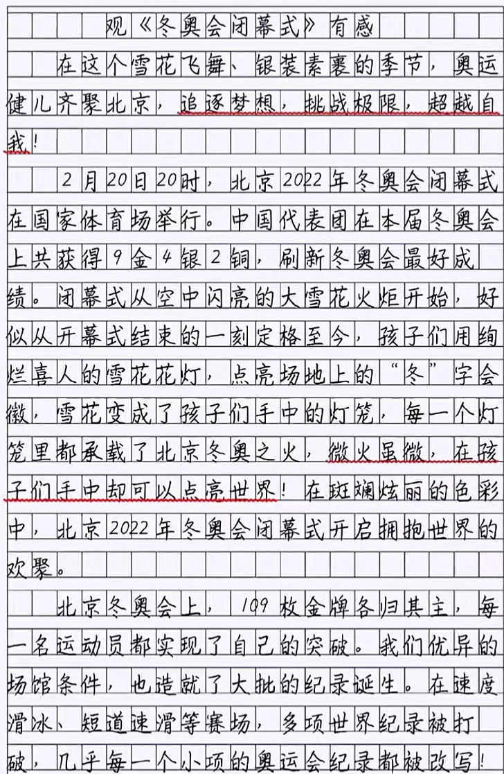 从这篇文章内容看,关注了冬奥会的每一个细节,而且还写得非常精彩,字里行间流露出真情实感,这是国人骄傲,也是我们最为自信的地方,不仅言辞到位,而且最大的亮点还在于这字迹的书写,不少老师看到后,都羡慕不已,甚至说道“写的一手好字,也是王道”,可见,对这位小学生的认可是多么高,从这字迹上看,不仅写出了工整美观范,而且还写出了书法范。