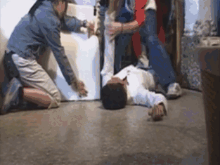 剧中有一幕,他出车祸后,被天瑜弟弟在地上拖来拖去“藏尸”。