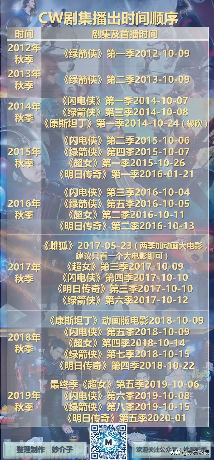 ""今天聊聊美剧《明日传奇第2季》。片名legends of tomorrow season 2 / dc's legends of tomorrow (2017),别名dc明日传奇。"在第一季中,明日传奇小队解决了达维尔·萨维奇的威胁,剧情告一段落。清除了达维尔·萨维奇后,鹰侠鹰女侠夫妻俩也就没有任务线,于是双双退出小队。季终时,雷克斯·泰勒登场,引出第二季的故事。第一季结尾出现的美国正义协会在本季多次出场,其成员雌狐也成了明日传奇小队常驻队员。雌狐加入小队,能力和人气都挺旺,2017年紧接着推出了雌狐个人动画剧集和一部整合剧集内容的《雌狐:大电影》。"鉴于《绿箭侠》《闪电侠》《明日传奇》《超女》经常出现四剧联动,有兴趣的观众可以按照下图顺序补完cw的电视剧。大家可以按照剧集播出时间来看,这样故事剧情都可以对的上,不会出现一头雾水的情况。"本季主要围绕命运之矛展开。消除达维尔·萨维奇的威胁后,明日传奇小队将自己的任务暂定为修复时空小裂隙,确保历史能够按照正常路线发展。其实吧,历史的正常路线本身就是一个伪命题。如果不存在宿命论的话,历史本是在一系列必然和偶然之中发展,一个小小的扰动都可能造成历史巨大变化。"第一季消灭了时空领主后,明日传奇似乎成了能够随意穿越时空的一群人。万万没想到,《闪电侠》中的逆闪电、艾尔伯德·斯旺(eobard thawne)阴魂不散,也想着利用穿越时间做一些坏事。这次出现的命运之矛,能量巨大,据称击穿了基督的眼球,吸收过基督殉难时的鲜血。掌控命运之矛的人可以根据自己的意愿,随意改写时空,简单的类比就是相当于拿到了镶满六颗无限宝石手套。"看过《闪电侠》的话,观众就会知道,斯旺作恶多端,他的祖先得知自己的后代是如此逆子,选择自尽,从根本上杜绝了斯旺的出生。斯旺四处逃窜,躲避时空鬼魂的追杀,想要修改时空,目的就是能够多苟活一段时间。"斯旺一面要躲避时空鬼魂的追捕,一面还要寻找分散在各个时空的命运之矛碎片,实在分身无力。于是斯旺勾结了cw其他几部剧中的将死反派,抛出诱人条件,组成反派联队,开始抢夺命运之矛。明日传奇小队自然要阻止斯旺的阴谋,豁出性命也要确保历史能够按照正常路线发展。"在《闪电侠》《绿箭侠》中混不下去的反派,打包来到《明日传奇》再就业,一群不甚成功的反派们,集体重新焕发职业生涯第二春。本季依旧围绕抗争命运,明日传奇小队明知参与历史发展会产生副作用,但依旧不得不硬着头皮去修改历史。两权相害取其轻,面对斯旺的威胁,产生一些时间副作用已经最好结果了。"本季整体依旧是肥皂剧的感觉,不要过于苛求,以穿越时空为卖点的剧很少有能够编的成功的。想看时间悖论的剧,大概也就四季完结的《十二猴子》能看看了。这部剧很像一个cosplay剧,明日传奇小队穿梭各个历史时期,换上当时当地的服饰,大玩特玩历史梗,十分有趣。"随着四部剧纷纷上线,cw的dc电视宇宙也打造得差不多了。于是万众瞩目的联动剧上线了。《明日传奇》第2季第7集就是四剧联动《支配者入侵》的第四部分。第一部分序言是11月29日登场的《超女》第2季第8集,第二部分上篇是11月30日《闪电侠》第3季第8集,中篇是12月1日的《绿箭侠》第5季第8集,最终完结是下篇12月2日的《明日传奇》第2季第7集。联动剧中,约20位超级英雄共同来亮相,正义联盟总部也首次亮相。"四剧联动的一大缺点就是,观众如果不将四部剧连起来看,很容易会一头雾水。好在在《明日传奇》这里,是四剧联动完结篇,算是给这个特别篇故事一个交代。联动剧和四部剧本身关联不大,只是取了其中人设,《支配者入侵》就像夹在四部剧中的一部大电影。科技更加发达的外星生物“支配者”感受到地球上存在超能力者们,认为超能力者们威胁到了支配者们的宇宙地位,于是想要先下手为强,占领地球消灭超能力者。于是绿箭侠、闪电侠、超女和明日传奇小队联手,保卫地球,合力抵抗支配者的入侵。联动剧的效果显而易见,超级英雄们大联欢带动了四部剧的收视率。不过我个人不喜欢联动剧,就像强制销售全家桶套餐一样,想单独追一部剧的话有些跳戏。"反派集体再就业,传奇组队齐拦截。