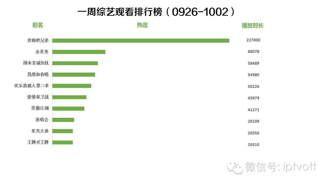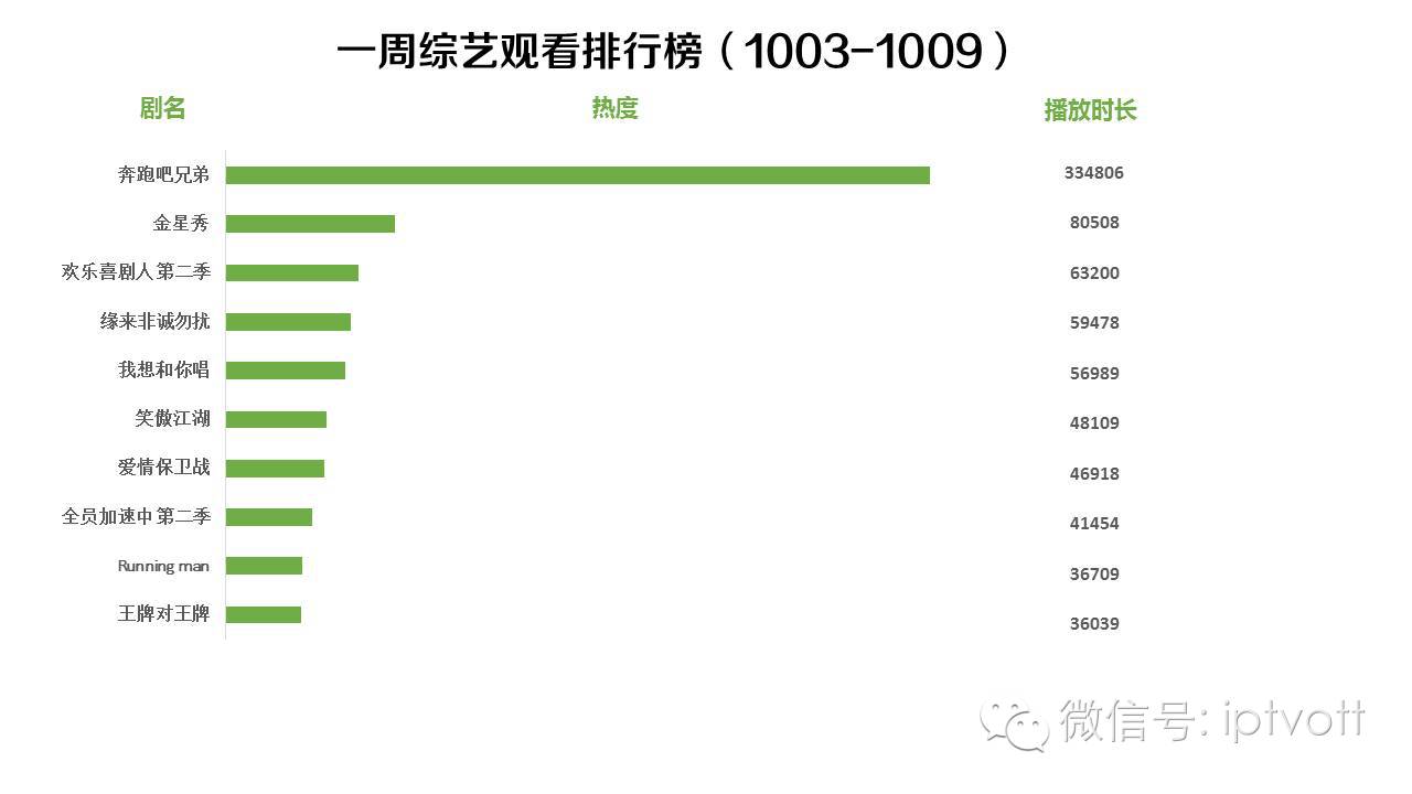 "综艺周榜:对比两周榜单,内容上的变化微乎其微,本周仅两档新节目入榜。本周榜单榜首之位仍是《奔跑吧兄弟》,这是该节目连续九周夺冠,《金星秀》本周继续稳坐榜单亚军之位,这也是该节目连续两周排在第二,上周榜单第五名《欢乐喜剧人第二季》本周排名升至第三,而上周榜单季军《缘来非诚勿扰》以及第四《我想和你唱》本周排名均下滑一位,分别降至第四与第五。上周榜单第七《笑傲江湖》与第六《爱情保卫战》本周排名互换位置,新入榜的《全员加速中第二季》《runningman》在本周榜单中分别排在第八与第九,上周排名垫底的《王牌对王牌》本周名次无任何变动,继续排在第十。另外,在上周榜单中排在第八的《演唱会》以及第九的《星光大道》本周双双落榜。