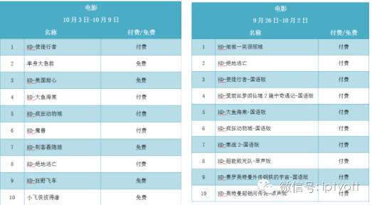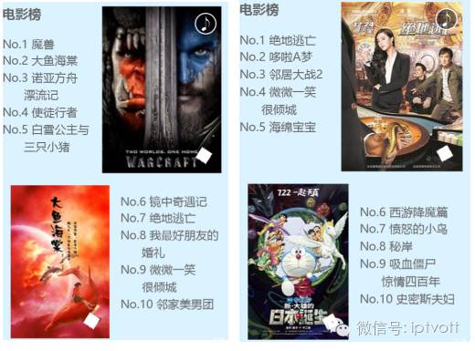 电影周榜:国庆节前一周榜单与国庆后第一周榜单的电影内容出入极大,本周榜单只有两部片子与上周重叠,其余八部均为新入榜电影。榜单前三甲便是新入榜影片,《魔兽》摘得榜首之位,《大鱼海棠》《诺亚方舟漂流记》紧随其后摘得亚军与季军。本周榜单的第四名由新入榜的近期大热电影《使徒行者》夺得,《白雪公主与三只小猪》《镜中奇遇记》分列本周榜单的第五与第六,这两部影片也是本周新入榜内容,作为本周为数不多已在上周上榜的内容——在上周榜单中夺冠的《绝地逃亡》与排名第四的《微微一笑很倾城》本周排名均大幅度下滑,仅排名第七与第九,本周榜单的第八《我最好朋友的婚礼》与最后一名《邻家美男团》均为新入榜电影。另外,在上周榜单中摘得第二与第三的《哆啦a梦》与《邻居大战2》本周双双落榜。