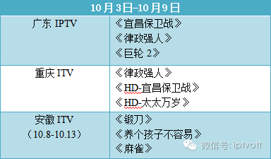 《宜昌保卫战》《律政强人》本周延续上周的强势表现,仍旧同时在广东与重庆两家榜单中上榜,且排名靠前。广东iptv电视剧榜单前三甲是《宜昌保卫战》《律政强人》《巨轮2》;《律政强人》《hd-宜昌保卫战》《hd-太太万岁》排名重庆itv电视剧榜单前三甲。安徽itv榜单冠亚季军分别是《锻刀》《养个孩子不容易》《麻雀》。