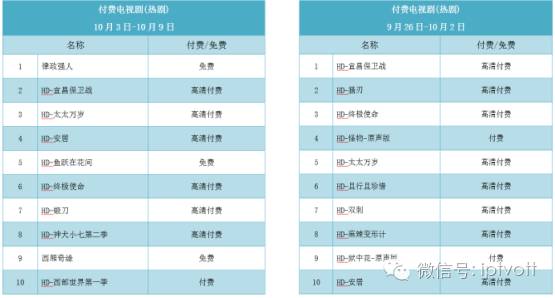 电视剧周榜:对比两周榜单,内容上的变动较为显著,本周有六档新剧入榜,且多为高清付费内容。新入榜的《律政强人》以及《hd-太太万岁》摘得本周的冠军与季军之位,上周榜单榜首《hd-宜昌保卫战》本周排名下滑一位至第二。在上周榜单中排名垫底的《hd-安居》本周名次跃至第四,新入榜的《hd-鱼跃在花间》《hd-锻刀》《hd-神犬小七第二季》分列本周榜单的第五、第七与第八,上周榜单的第三《hd-终极使命》本周名次跌至第六,本周榜单的最后两个席位也是新入榜影片,依次是《西厢奇缘》与《hd-西部世界第一季》。另外,在上周榜单中,摘得亚军之位的《hd-猎刃》本周被挤出榜单,上周榜单的第四名《hd-怪物-原声版》、第六名《hd-且行且珍惜》、第七名《hd-双刺》本周也落榜,同时,在上周榜单中排名较为靠后,即第八的《hd-麻辣变形计》以及第九的《hd-狱中花-原声版》本周也双双落榜。
