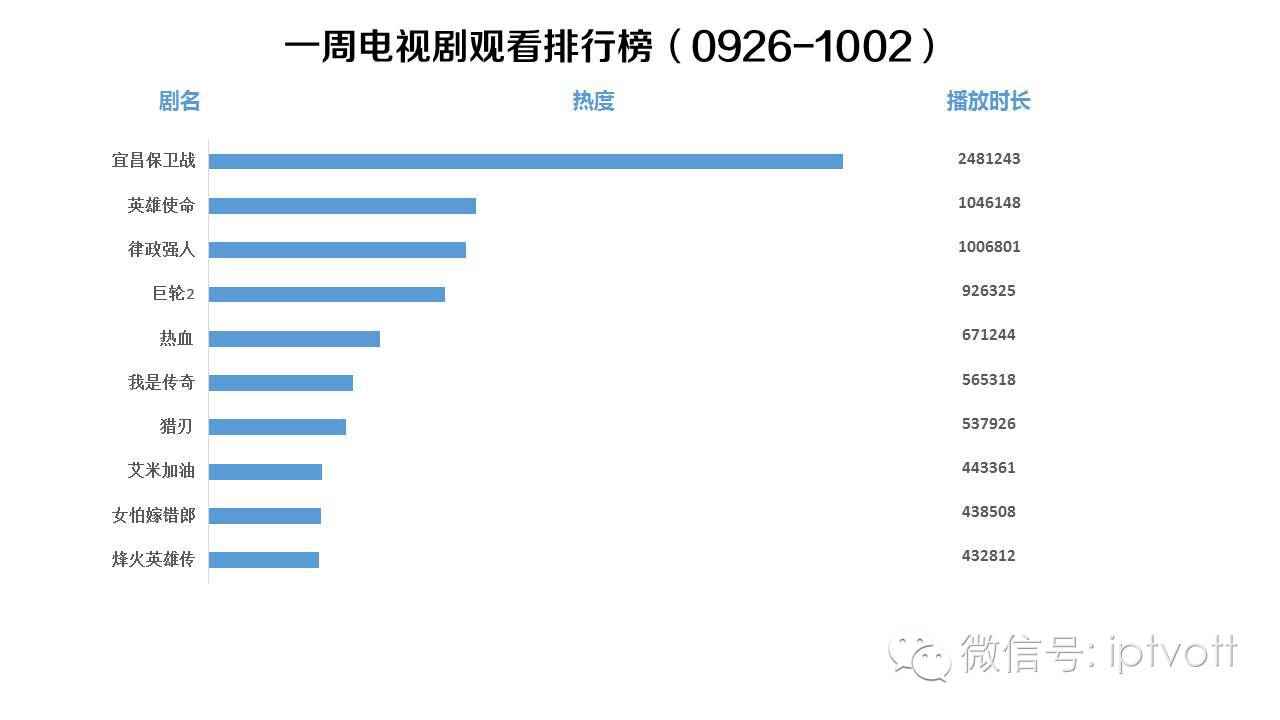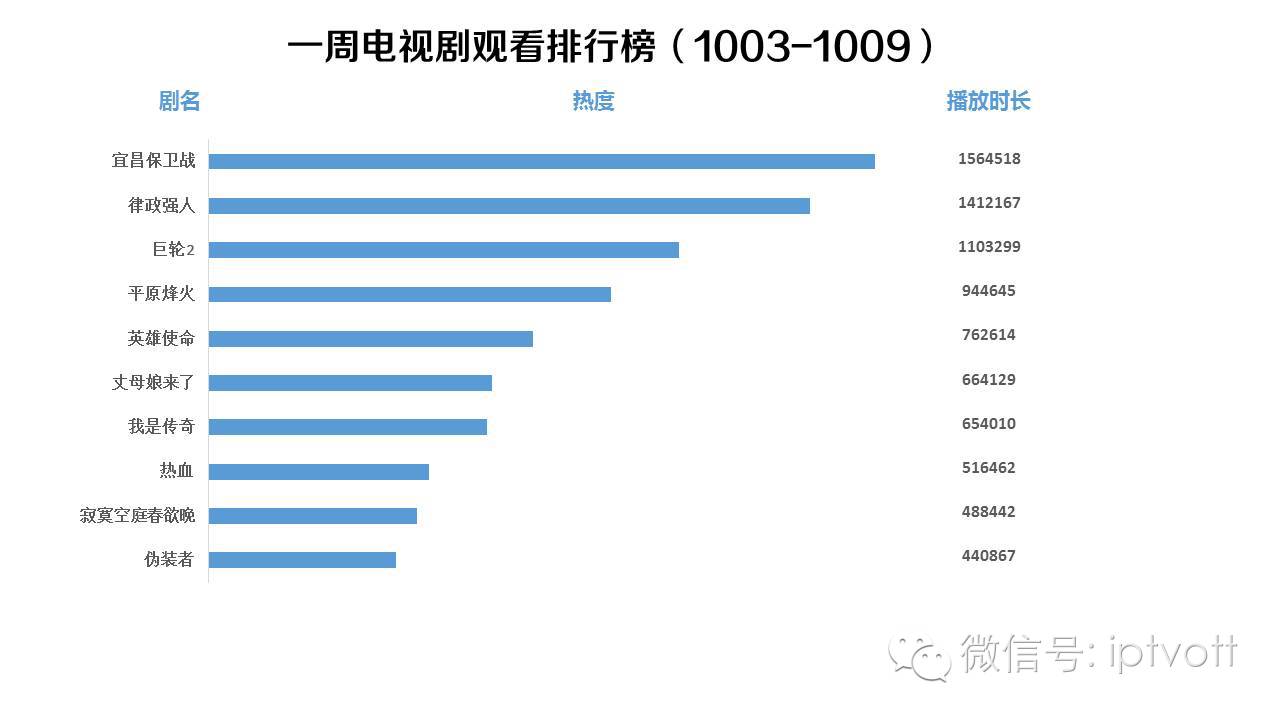 "电视剧周榜:对比两周榜单,内容上的变化不是很大,本周有四档新剧入榜,且均集中在榜单的后半段。《宜昌保卫战》本周继续领跑电视剧榜,这是该剧连续两周夺冠,上周榜单第三《律政强人》与第四《巨轮2》本周名次均上升一位,分别至第二与第三。新入榜的《平原烽火》摘得本周第四名之位,上周榜单亚军《英雄使命》本周排名跌至第五,本周榜单第六《丈母娘来了》、第九《寂寞空庭春欲晚》以及第十《伪装者》均为新入榜剧集,在上周榜单中排名第五的《热血》以及第六的《我是传奇》本周排名跌至第八与第七。另外,在上周榜单中排名第七的《猎刃》、第八的《艾米加油》、第九的《女怕嫁错郎》以及第十的《烽火英雄传》本周均跌落榜单。