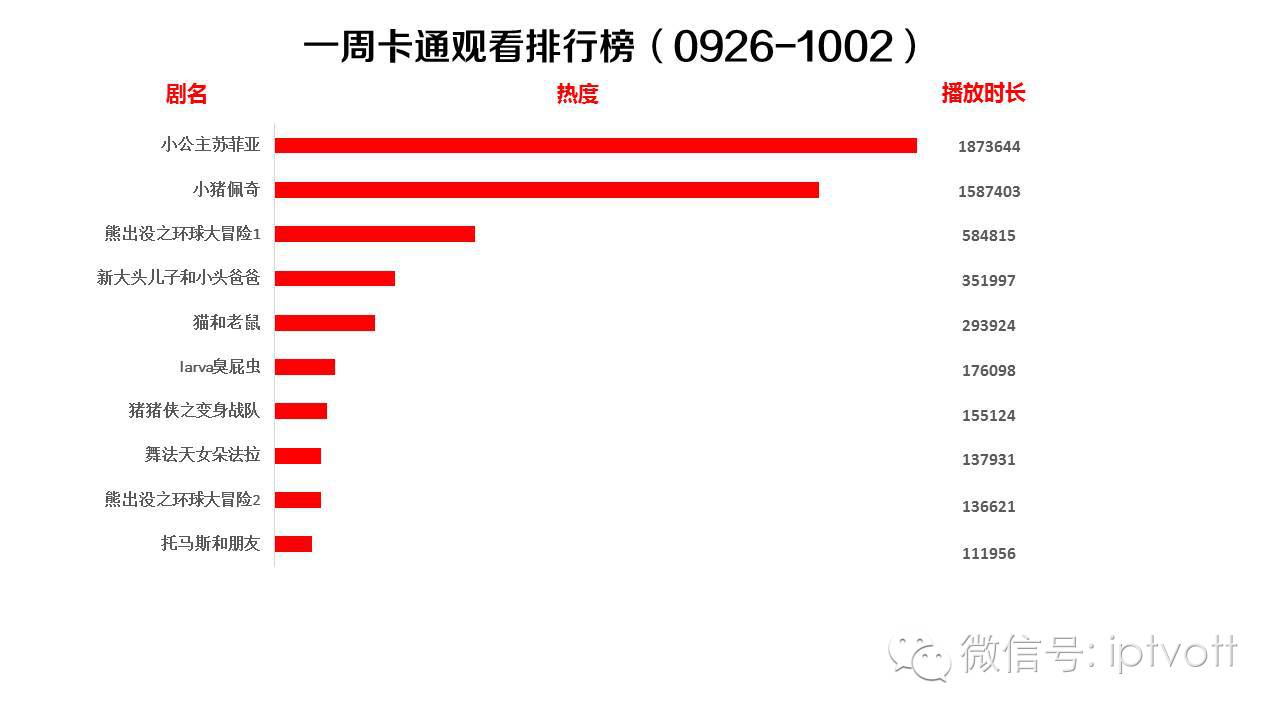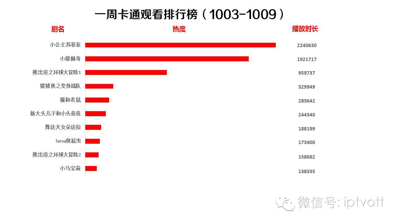 "少儿周榜:本周仅一档新节目入榜,其余均是排名上的小幅变动。本周榜首之位仍是《小公主苏菲亚》,《小猪佩奇》《熊出没之环球大冒险1》本周排名也无任何变化,继续排在第二与第三,这是这三档卡通内容连续四周排名无变化,《猪猪侠之变身战队》本周排名有所上升,由上周第七升至本周第四,《猫和老鼠》本周排名无变化,稳居第五。上周排名第四的《新大头儿子和小头爸爸》本周名次有所下滑,跌至第六,《舞法天女朵法拉》名次由上周第八升至本周第七,本周榜单第八名由上周第六《larva臭屁虫》摘得。本周榜单第九无变化,仍是《熊出没之环球大冒险2》,新入榜的《小马宝莉》摘得本周榜单最后一个席位。另外,在上周榜单中排名第十的《托马斯和朋友》被挤出榜单。
