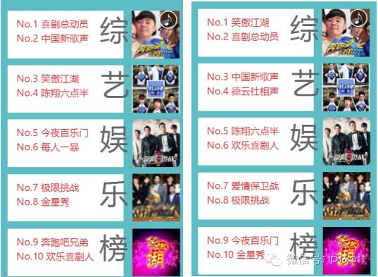 综艺周榜:本周榜单内容上的变化不是很大,仅三档新节目入榜,其余均为排名上的变化。上周榜单亚军《喜剧总动员》与季军《中国新歌声》本周排名均上一位,分别升至榜首与第二名,而上周榜单冠军《笑傲江湖》本周名次滑至第三。《陈翔六点半》本周排名小幅度善生,由上周第五升至本周第四,而在上周榜单中排名倒数第二(即第九)的《今夜百乐门》本周名次连升四位至第五,新入榜的《每人一暴》摘得本周榜单的第六,上周排名第八的《极限挑战》以及第十的《金星秀》本周名次均处于上升态势,分别升至第七与第八。本周榜单第九《奔跑吧兄弟》是新入榜节目,第十由上周榜单的第六《欢乐喜剧人》摘得。另外,在上周榜单中排名第三的《中国新歌声》与第四的《德云社相声》本周双双落榜,上周榜单的第七名《爱情保卫战》本周也被挤出榜单。
