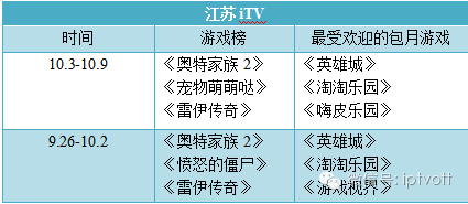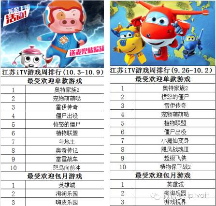 《奥特家族2》本周排名无变化,稳居榜首,《宠物萌萌哒》本周排名有所上升,由上周第四升至本周第二,《雷伊传奇》本周排名如榜首内容一样也很稳定,继续排名第三。上周排名第六的《僵尸出没》本周名次升至第四,另一款僵尸游戏《愤怒的僵尸》本周名次由上周第二降至第五。而上周榜单第五《植物联盟》本周排名降至第六。新入榜的《斗地主》《奥奇传记》《雷霆战车》《怒鸟向前冲》分别在本周榜单中排在第七至第十名。另外,在上周榜单中排名第七的《小魔仙变身》、第八的《飓风战魂3》、第九的《超级飞侠》以及第十的《植物保卫战2》本周均被挤出榜单。近两周江苏itv游戏榜单中最受欢迎包月游戏前三甲本周变化不是很大,榜单前两名无任何变化,仍旧是《英雄城》与《淘淘乐园》,新入榜的《嗨皮乐园》摘得本周榜单季军之位,与此同时,上周榜单的第三名《游戏视界》被挤出榜单。