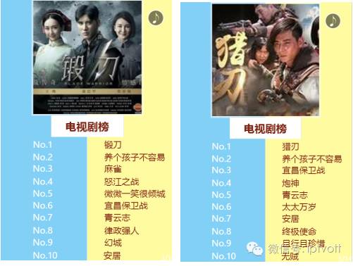 电视剧周榜:本周内容上的变化较于上周而言较为明显,有六档新剧入榜。本周新入榜的《锻刀》与《麻雀》摘得本周榜首与季军之位,《养个孩子不容易》排名无变化,稳居第二。《怒江之战》《微微一笑很倾城》紧随其后分列本周榜单的第四与第五。上周榜单季军《宜昌保卫战》、第五名《青云志》本周名次均下滑,分别降至第六与第七,《律政强人》《幻城》分别排名第八与第九,这两档剧均为新入榜内容,上周排名第七的《安居》本周名次跌至第十,排名垫底。另外,在上周榜单中夺冠的《猎刃》以及排名第四的《炮神》本周双双落榜,上周榜单的第六名《太太万岁》、第八名《终极使命》、第九名《且行且珍惜》以及最后一名《无贼》本周也都被挤出榜单。