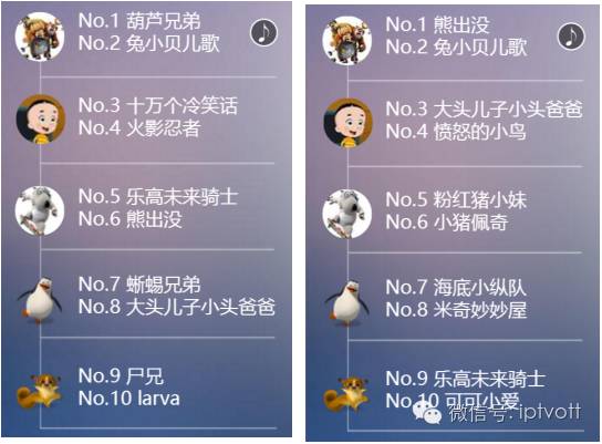 动漫周榜:对比两周榜单,内容上的变化还是较为明显,本周有六档新内容入榜。本周首次入榜的新内容《葫芦兄弟》强势夺冠,《兔小贝儿歌》北周排名无变化,稳居第三。新入榜的《十万个冷笑话》《火影忍者》分列本周榜单的第四与第五,上周榜单的第九《乐高未来骑士》本周排名升至第五,在上周榜单中高居榜首的《熊出没》本周名次跌至第六,新入榜的《蜥蜴兄弟》以及上周第三《大头儿子小头爸爸》分别在本周榜单中排名第七与第八。本周榜单的最后两个席位均为新入榜内容,依次是《尸兄》与《larva》。另外,在上周榜单中排名第四的《愤怒的小鸟》、第五的《粉红猪小妹》、第六的《小猪佩奇》本周均落榜,与此同时,上周榜单的第七名《海底小纵队》与第八名《米奇妙妙屋》、第十名《可可小爱》本周也被挤出榜单。