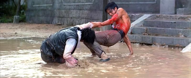 大雨倾盆,两人用竹竿做武器,开始对决,雨水、泥水、血水混到一起……