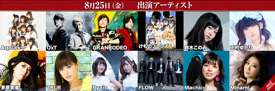 8月25日:aqours、oxt、granrodeo、兽娘动物园、铃木木乃美、田村由加莉、茅原实里、true、pyxis、flow、machico、minami(栗林美奈实)。