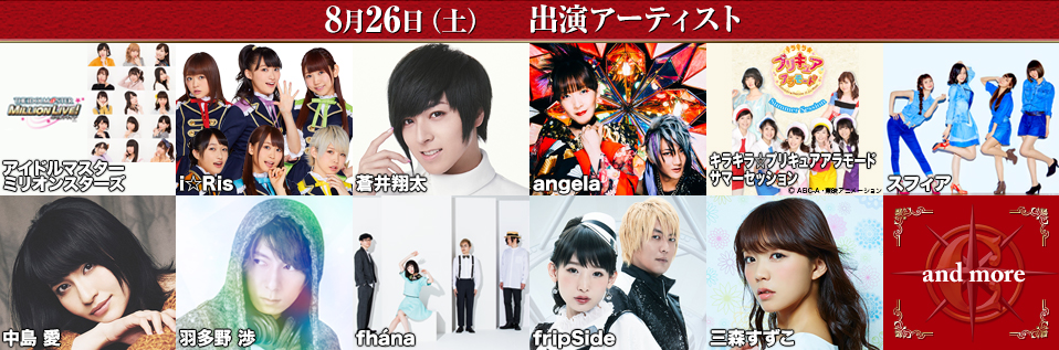 8月26日:偶像大师百万演唱会、i☆ris、苍井翔太、angela、光之美少女、sphere、中岛爱、羽多野涉、fhana、fripside、三森铃子。