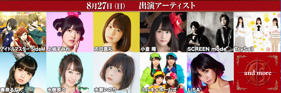 8月27日:偶像大师sidem、上坂堇、内田真礼、小仓唯、screen mode、trysail、春奈露娜、水树奈奈、水濑祈、少女福尔摩斯、lisa。