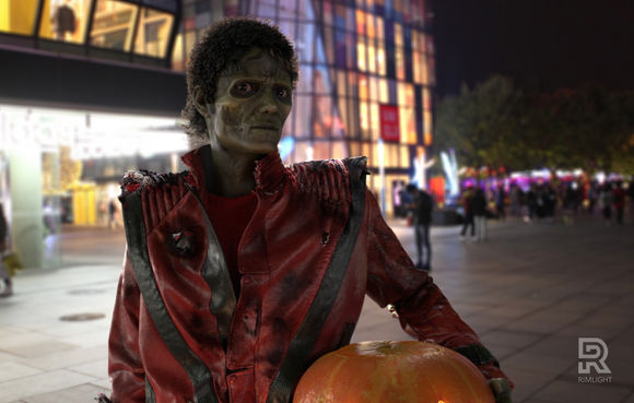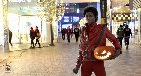一位迈克尔的超级粉丝在万圣节夜出现在三里屯,他全身红色衣服着装,并且手里提着南瓜灯,完全看不出一点恐怖的感觉。