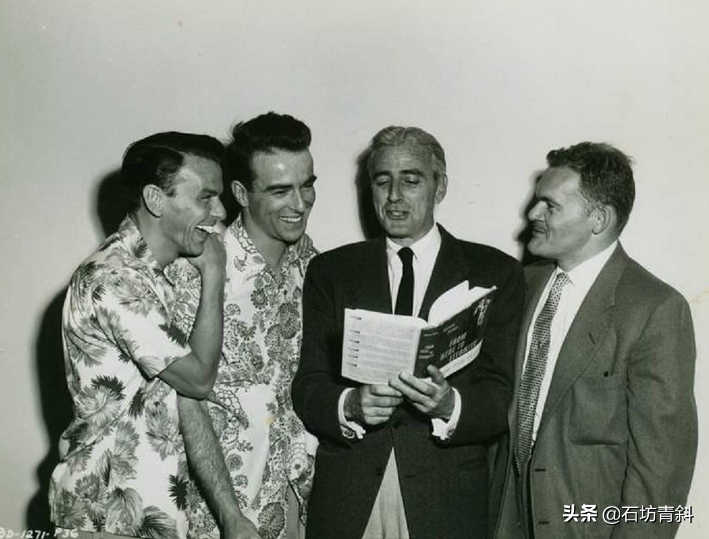 照片从左至右:弗兰克·辛纳特拉frank sinatra、蒙哥马利·克里夫特montgomery clift编剧丹尼尔·塔拉达什daniel taradash以及原著作者詹姆斯·琼斯james jones在电影《乱世忠魂/红粉佳人from here to eternity》(1953)拍摄期间留影