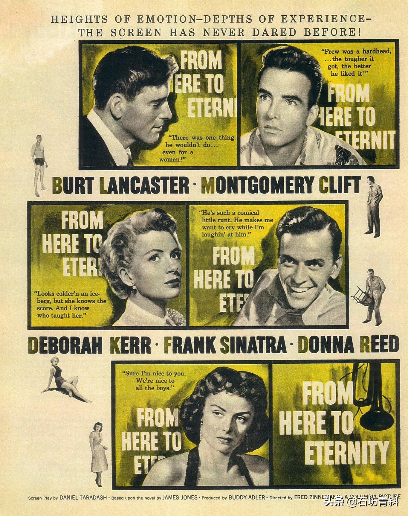 在这部以蒙哥马利·克里夫特这位调派来的士兵为主线,伯特·兰卡斯特和黛博拉·蔻儿deborah kerr(1921-2007)的偷情为副线,另外蒙哥马利·克里夫特与唐娜·里德donna reed(1921-1986)的爱情、与弗兰克·辛纳特拉frank sinatra(1915-1998)的友谊、以及与伯特·兰卡斯特的这样的上司之间的惺惺相惜,构成一部非常好看的影片。