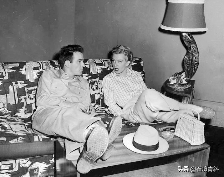 马龙·白兰度marlon brando(左)拍完《飞车党the wild one》(1953)后就跑到《乱世忠魂/红粉佳人from here to eternity》(1953)片场,实则来探班,其实就是想找蒙哥马利·克里夫特montgomery clift(右)玩,还必须掩人耳目,这不导演弗雷德·金尼曼fred zinnemann站中间给媒体拍