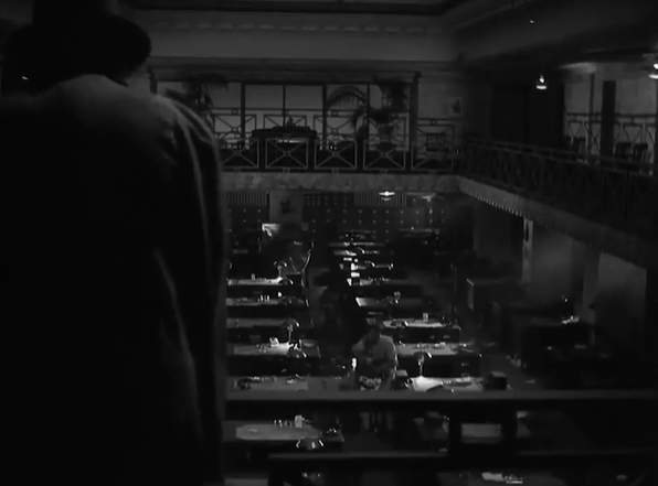 然而,一旦观众跟随角色步入片中那个保险公司时,就能感受到其中表现主义风格的布景,房间昏暗,灯光暗淡,夸张的低角度镜头则预示着主人公即将坠入邪恶。