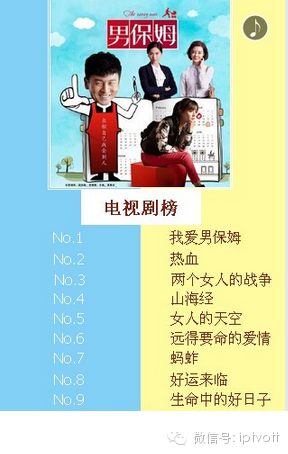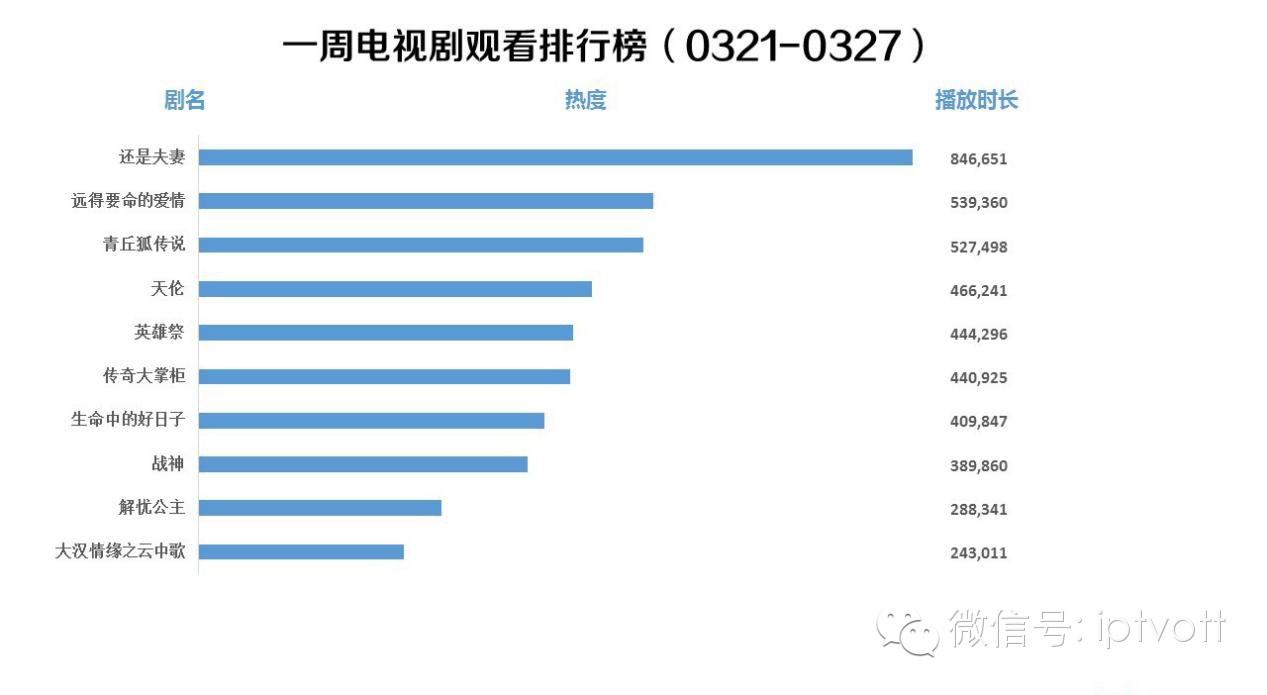广东iptv:广东iptv发布3月14日-3月20日电视剧、电影、综艺、卡通节目观看排行榜。电视剧观看排行榜前三位是:《还是夫妻》《远得要命的爱情》《青丘狐传说》;电影观看排行榜前三位是:《恶棍天使》《绝地战警》《叶问2宗师传奇》;综艺观看排行榜前三甲《王牌对王牌》《奔跑吧兄弟》《欢乐喜剧人》;卡通观看排行榜前三位是:《新大头儿子和小头爸爸》《熊出没之丛林总动员》《倒霉熊(第三部)》。