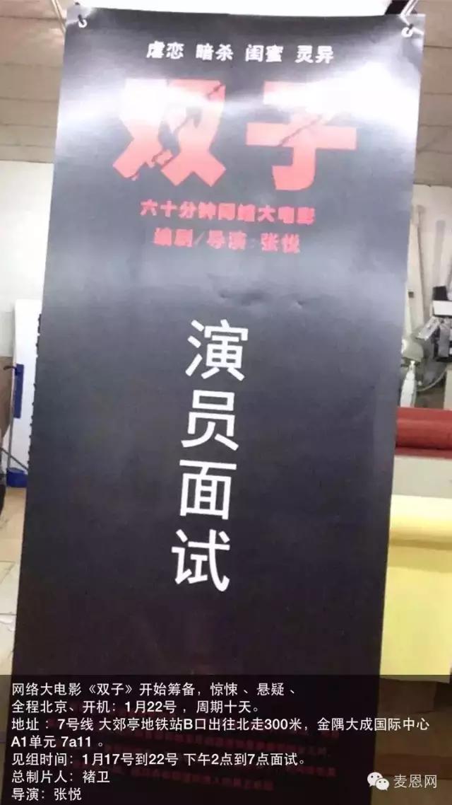 麦恩网与北京欢乐无限文化传播公司联合出品的电影《双子》已进入演员面试阶段。北京的演员们,速度、速度、速度噢!