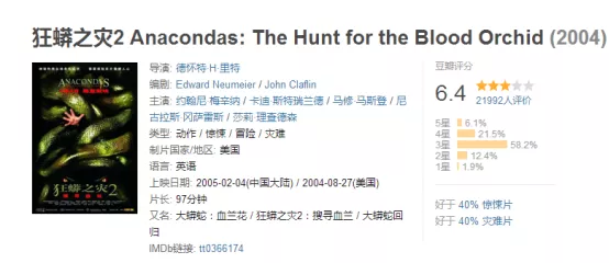 接下来。为大家梳理一些爬行动物的灾难片,首当其冲的就是狂蟒之灾系列,非常经典,但是豆瓣平台一般对灾难性影片打分较低,所以请忽略下分数,不过按照我看过的经验和结合豆瓣的打分,4分以下的灾难片还是可以不用看的,特技或者剧情都是被吐槽的点。爬行动物的灾难片以蟒蛇和鳄鱼为主