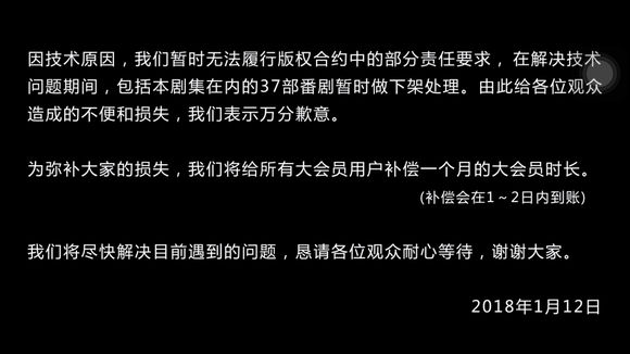 今早凌晨五点,b站发布了如下的通知,通知表明由于某些“技术原因”,将下架37部番剧,并会给所有开了大会员的用户补偿一个月的大会员。