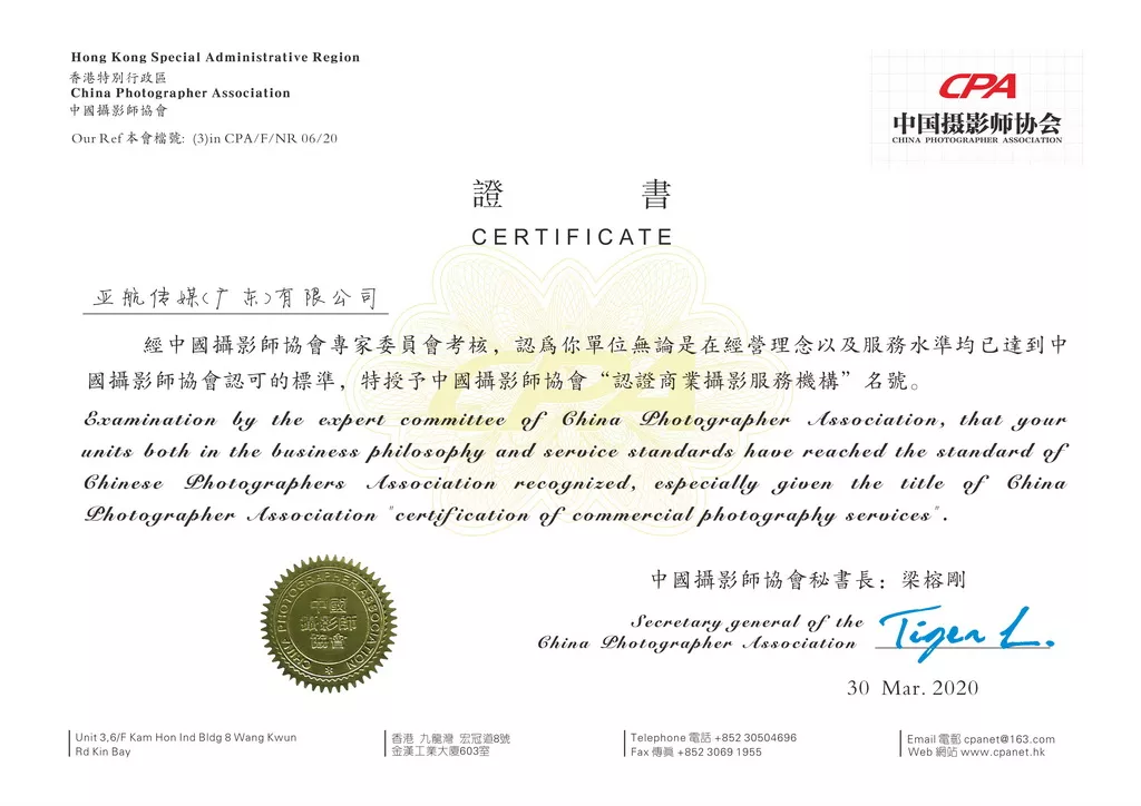 亚航传媒(广东)有限公司已录入中国摄影师协会中国商业摄影精英汇名册,详情浏览中国摄影师协会官网(www.cpanet.hk)。