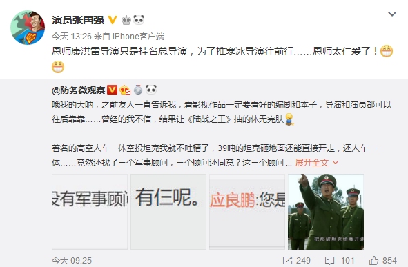 显然,知名军事博主“防务微观察”对《陆战之王》的主角人设和故事内容都有真实度上的吐槽。电视剧内容本身,便是仁者见仁的。面对质疑,演员张国强如此帮助老师康洪雷回应:
