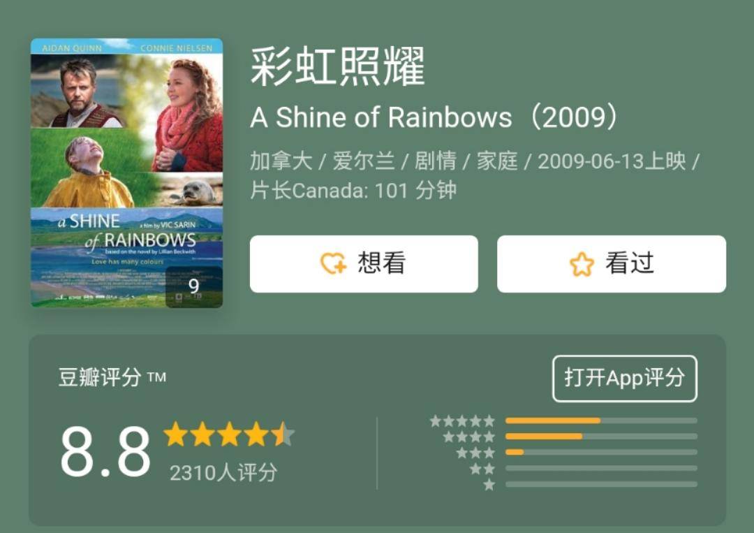 这部影片,是由vic sarin执导的一部浪漫温情的剧情片,在爱尔兰取景,由康妮·尼尔森和艾丹·奎因出演。女主角康妮·尼尔森非常有气质,并且能说7种语言,出演过《魔鬼代言人》《角斗士》等好莱坞卖座影片。该片仅历时28天完成拍摄,但上映后评价很高,被网友评为高于98%的家庭片,获得豆瓣评分8.8。