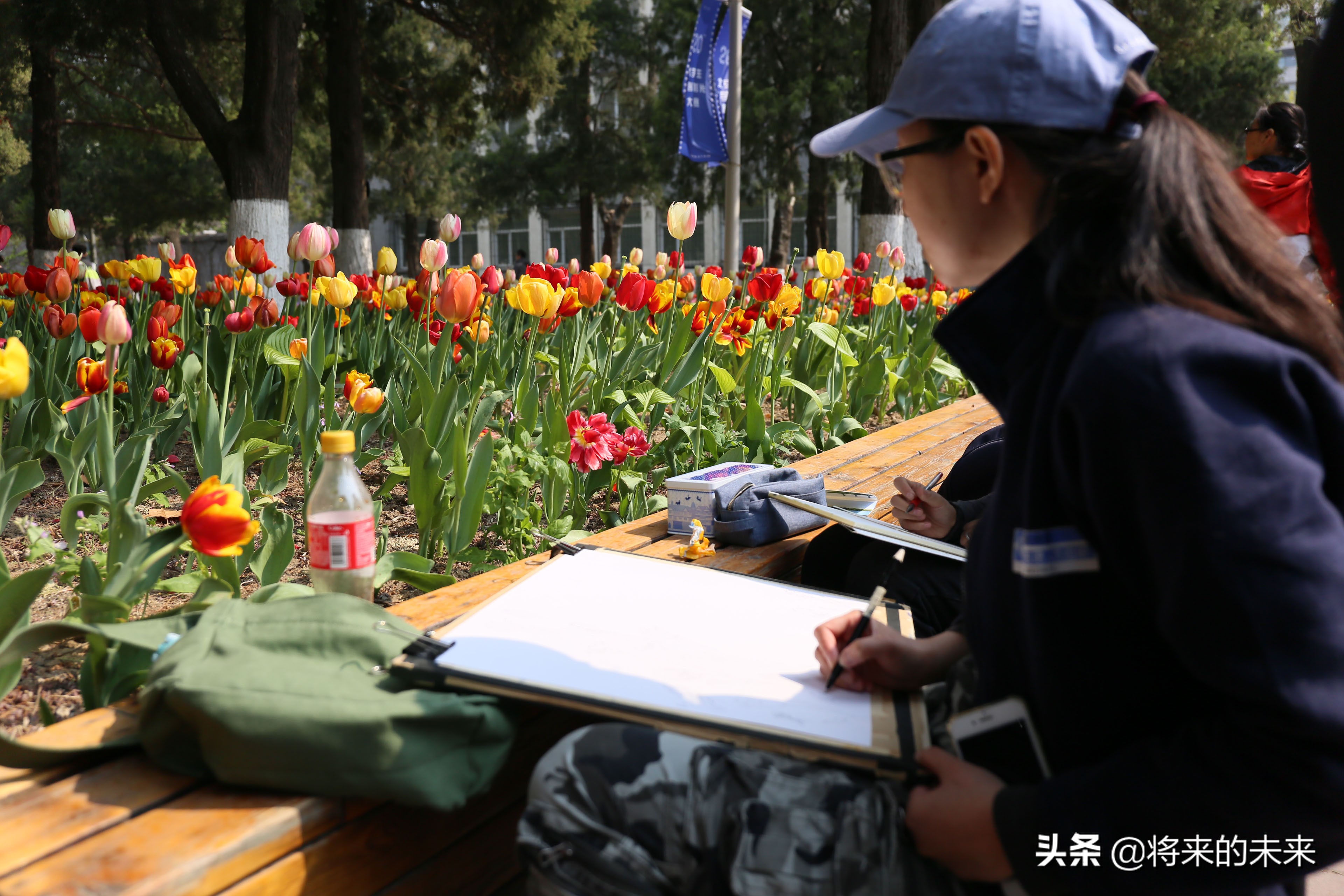 在郁金香旁还有画画爱好者拿起笔记录这美好的校园风光。