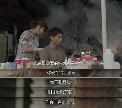 第8集气氛缓和了一些,从救援场景切换到了医务室场景。乔妹跟着宋仲基到大本营给高班长的老婆打电话,打完电话心情沉重跟宋仲基有了如下对话,宋仲基也是随时撩妹的机智boy,说的话真是随时让我全身苏,这些话都很好地安抚了乔妹受伤的心灵。乔妹也极少地表达了对宋仲基的依赖和感谢,男生在你最需要的时候陪在你身边一定是最打动女生的一件事,这算他们感情更进一步的苗头。
