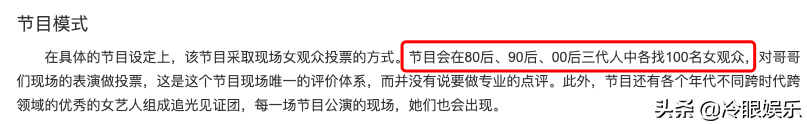 至于为什么要找不同年龄段的男艺人,因为节目要做一个“由各个年代偶像组成的中国男性偶像团体”。