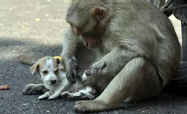 月前,一只印度的猕猴在马路上救了一只可怜的小狗。猴子在流浪狗群中成功的保护了这只小狗,防止它受到伤害,当地人们看到这一幕被深深感动了,于是纷纷给这一“罕见组合”留下了食物。更出乎人们意料的是,这只猴子简直是爱心天使的化身,它把吃的让给狗狗先吃,然后它静静的在旁边守护着小狗。