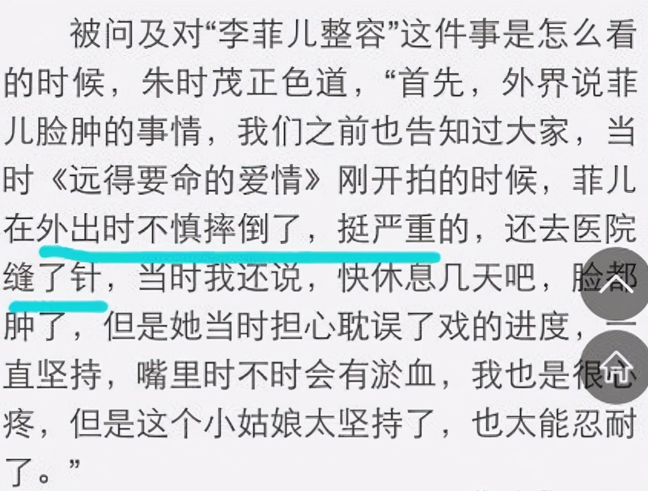2016年,电视剧《远得要命的爱情》热播,网友觉得她的脸变化很大,导演朱时茂出面为她澄清,“菲儿外出时不慎摔倒了,挺严重的,还去医院缝了针。她担心耽误了戏的进度,一直坚持。”