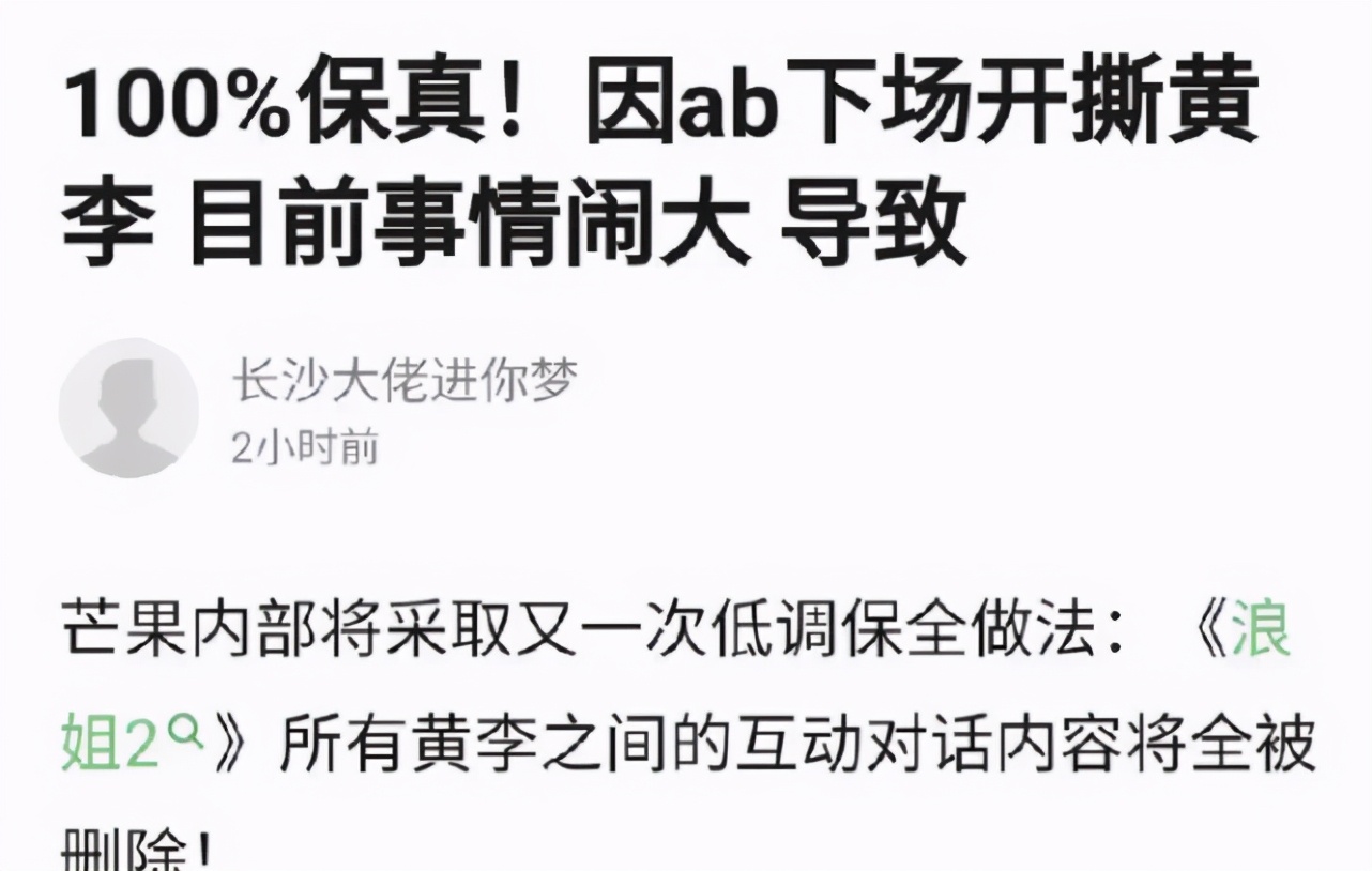 芒果台反应倒是很快,这不,立刻就有网友爆料,为了一切低调行事的《浪姐2》顺利播出,节目组已经打算删除李菲儿和黄晓明互动的所有镜头。