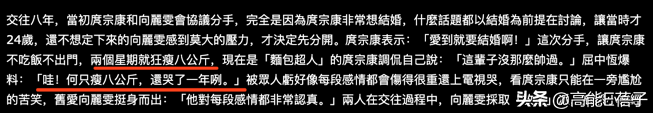 据说两人是因为结婚的事情谈崩,向丽雯害怕结婚,而康哥想要结婚,两人分手后庹宗康两星期狂瘦8公斤,屈中恒爆料他还哭了一个星期。