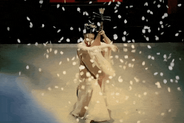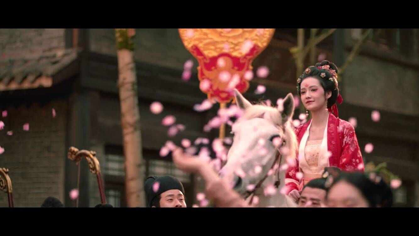 一出场,犹抱琵琶半遮面,在落英缤纷间自顾弹琴,就瞬间拍出了角色的英气冷感,哪怕是不中意她的观众也要承认,这画面有点带感。
