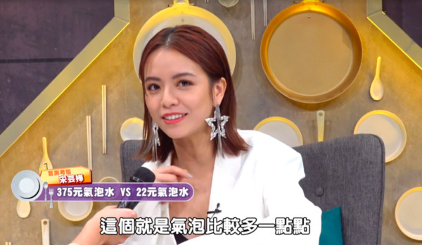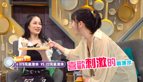 千千拿到气泡水后,从两杯的细致度与气泡量判断平价与高价,透露高价的不但气泡较细,里面也感觉有较多矿物质;平价则相对气泡较粗,也比较刺激一点。她甚至正确地猜出气泡水品牌,还笑称自己「喜欢比较刺激的气泡水」,仿佛「气泡水达人」。