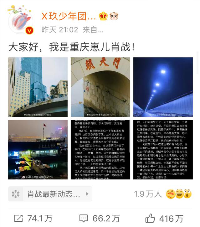 “反正我不会用网红城市来形容它(重庆)。网红城市概括不了它,我觉得重庆是很有自己内心的核在的一个城市”,在《奇妙之城》中,肖战如此评价他心中的重庆。他也将这一点写在了昨晚的微博中:“你可以称这座城市是‘网红’,但我更喜欢称她为‘江湖’。”