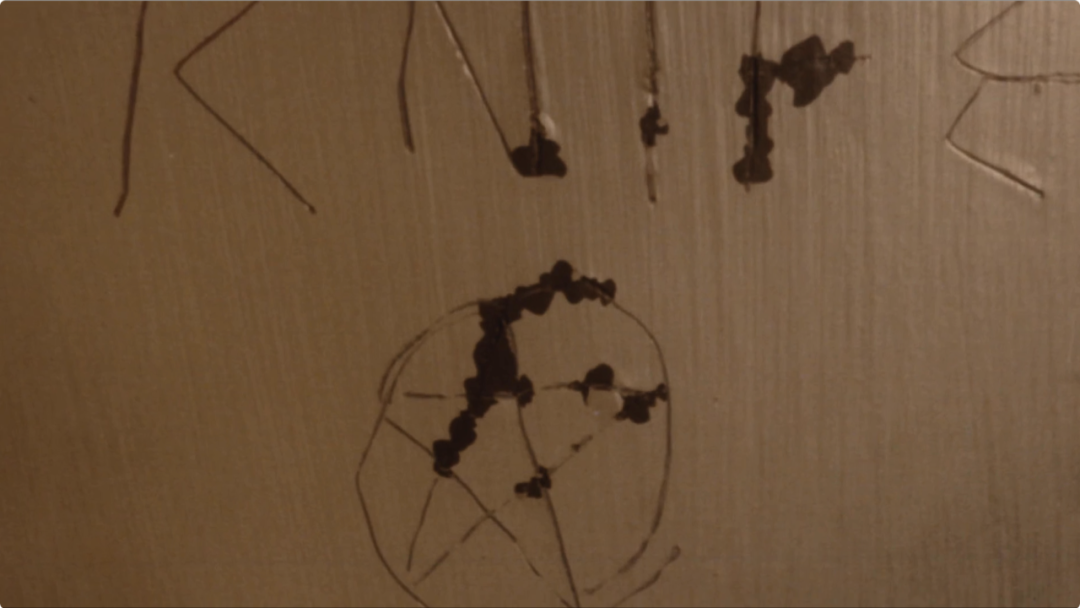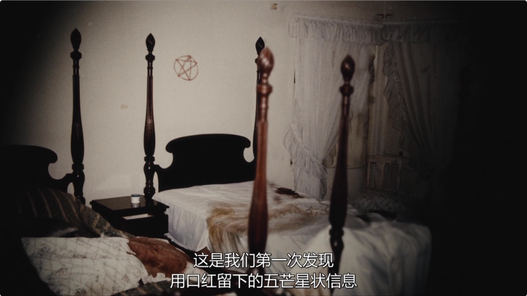 凶手用口红在墙壁和受害人的腿上留下了五芒星状的图案。